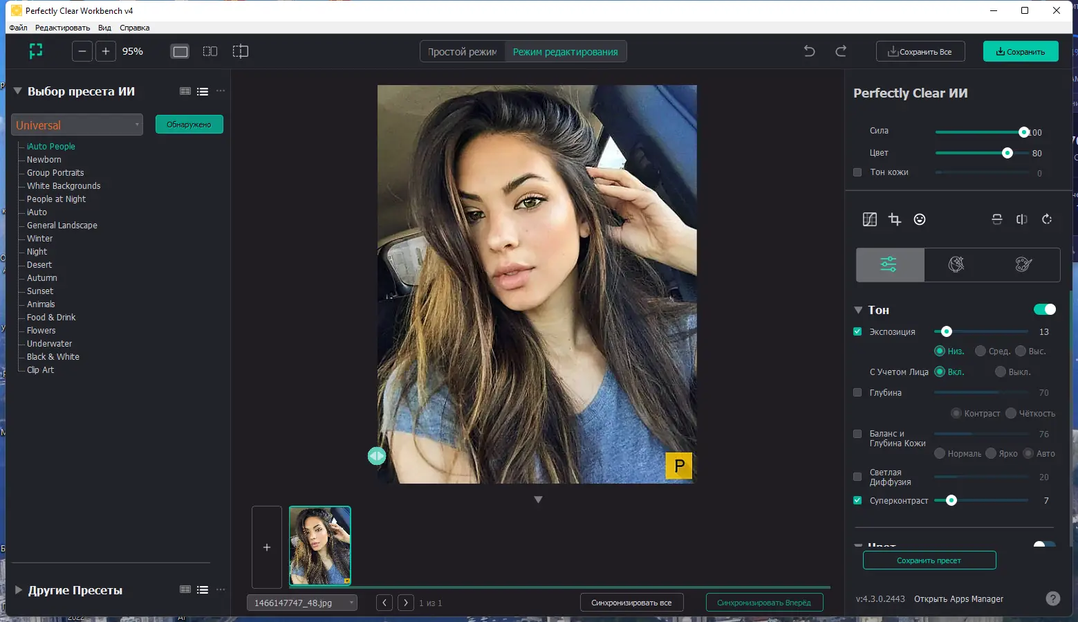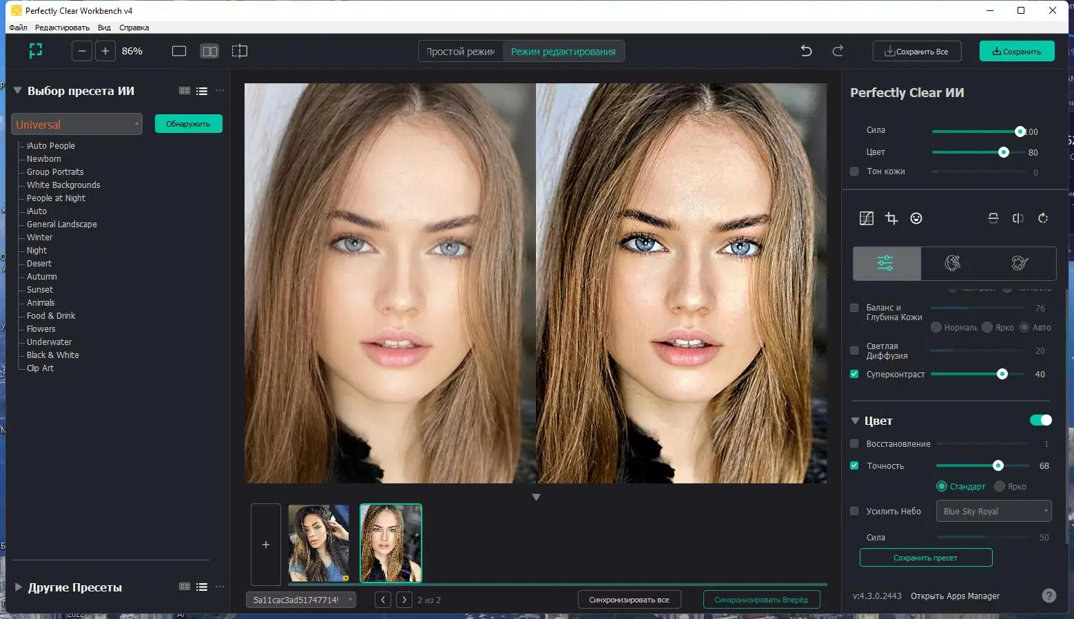 Perfectly Clear — это не просто фильтр, а комплексное решение для улучшения качества изображений с применением запатентованных алгоритмов. Разработка основана на более чем десятилетних исследованиях в области цифровой обработки изображений. Программа эффективно устраняет типичные проблемы, возникающие при съёмке: шумы, засветки, неестественный тон кожи, эффект «красных глаз» и другие искажения. Благодаря интеллектуальному анализу, она адаптирует параметры коррекции под особенности каждого снимка, обеспечивая естественный и выразительный результат.