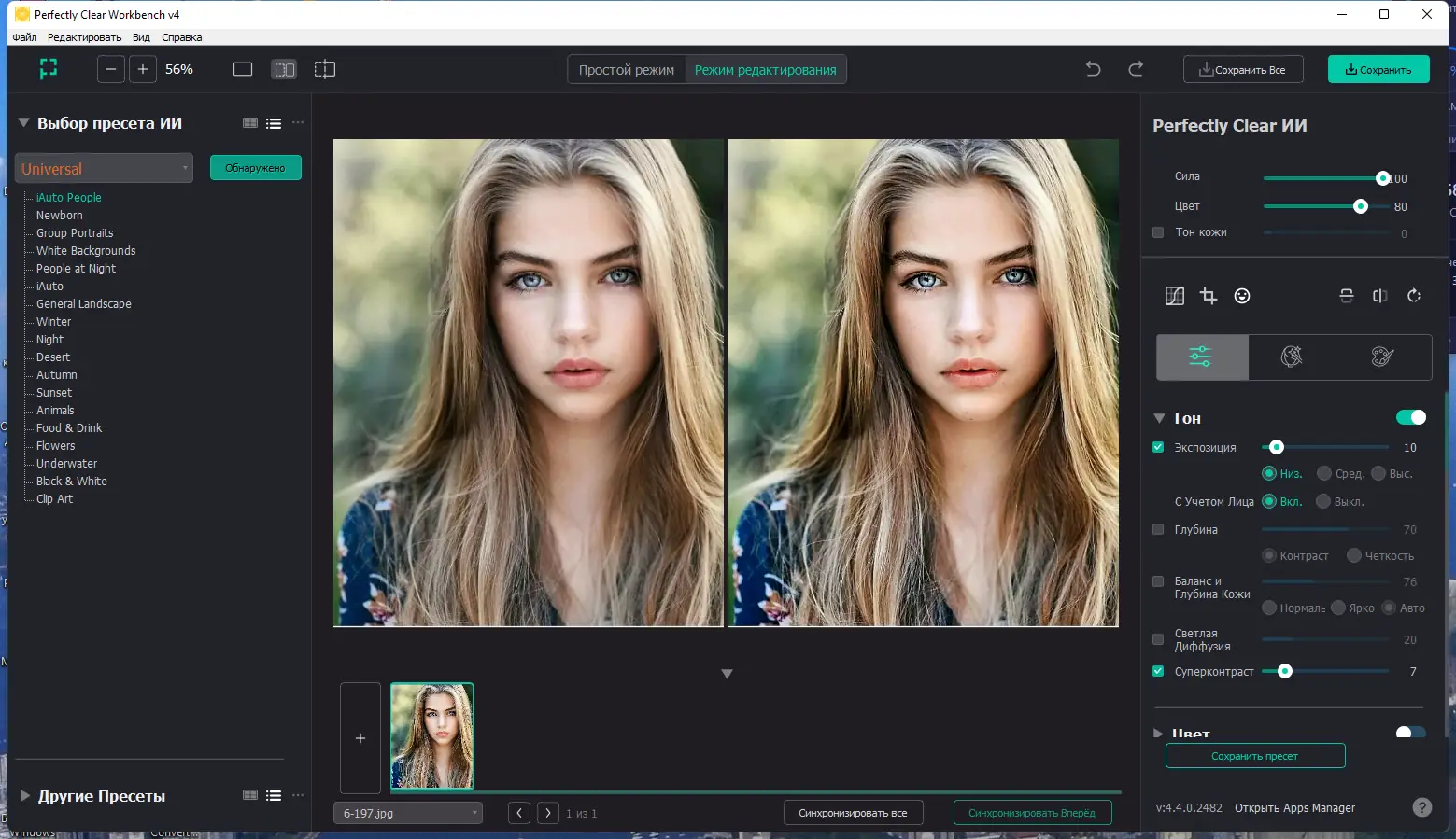 Perfectly Clear — это не просто плагин, а полноценное приложение, позволяющее улучшать фотографии с минимальными усилиями. Работа построена на запатентованных алгоритмах, результатом десятилетних исследований в области цифровой обработки изображений. Программа анализирует фото и применяет до десятка корректировок одновременно, восстанавливая баланс белого, насыщенность, экспозицию и резкость. Это делает её особенно полезной для обработки большого количества снимков, например, в рамках свадебной или портретной съёмки.