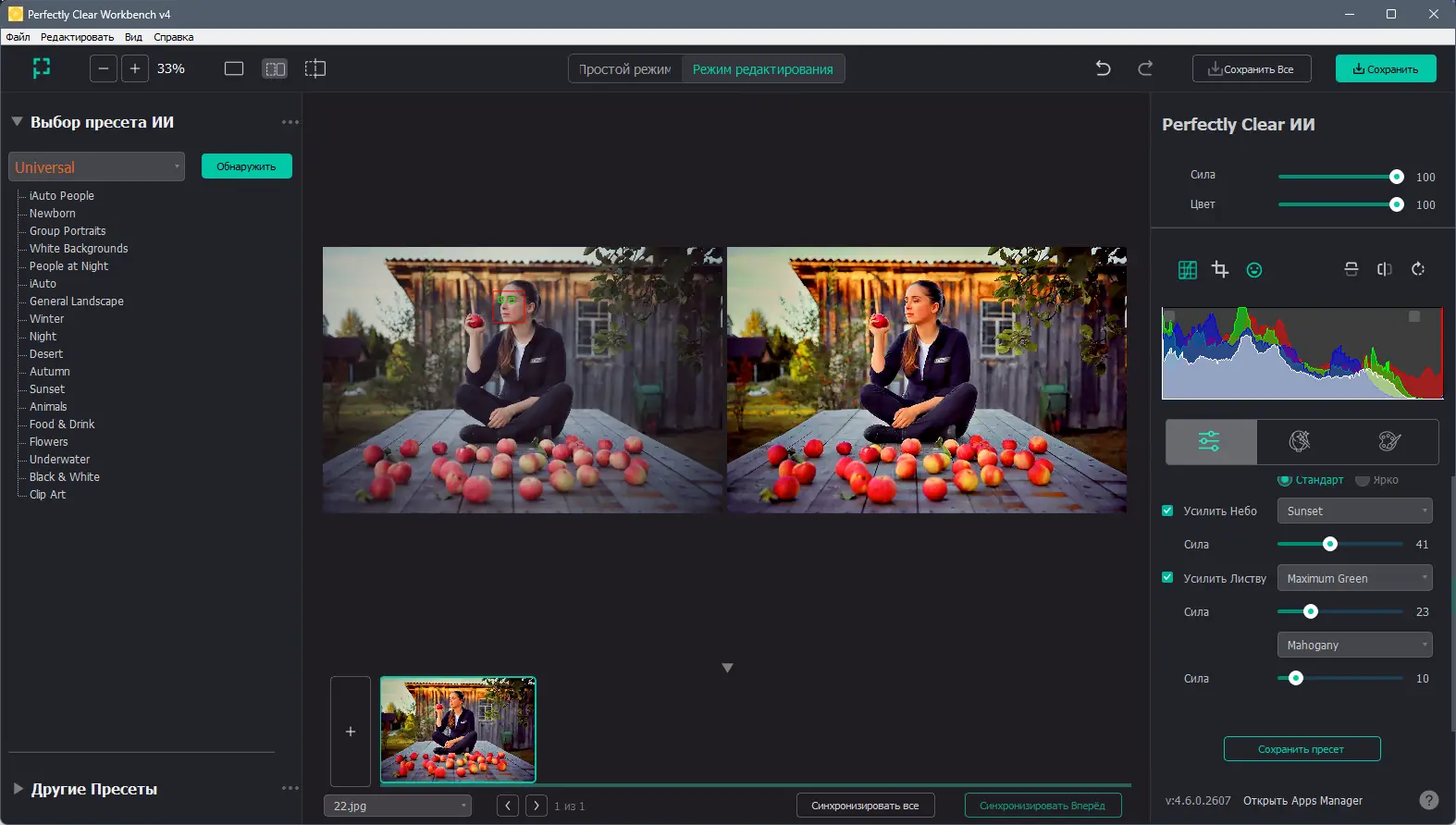 Perfectly Clear WorkBench — это не просто редактор изображений, а комплексное решение для улучшения фотографий с использованием запатентованных алгоритмов. Что это за программа, если не инструмент, собравший в себе более десяти лет исследований в области цифровой обработки изображений? Она разработана для устранения типичных дефектов, возникающих при съёмке: шумов, засветок, размытости, эффекта «красных глаз» и неестественного тона кожи. Программа работает как в автоматическом режиме, анализируя и корректируя снимки за секунды, так и в ручном, позволяя тонко настраивать параметры.
