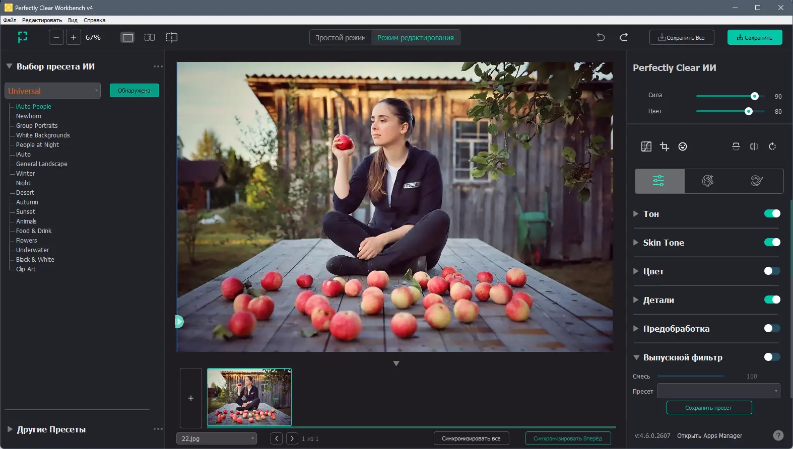 Perfectly Clear WorkBench — это мощный инструмент для автоматической и ручной коррекции фотографий, сочетающий передовые технологии обработки изображений с интуитивным интерфейсом. Программа устраняет дефекты снимков, вызванные техническими ограничениями камер, и восстанавливает цвет, экспозицию, резкость и тон кожи, превращая даже слабые фото в качественные изображения. Подходит как для новичков, так и для профессионалов, работающих с цифровой графикой.