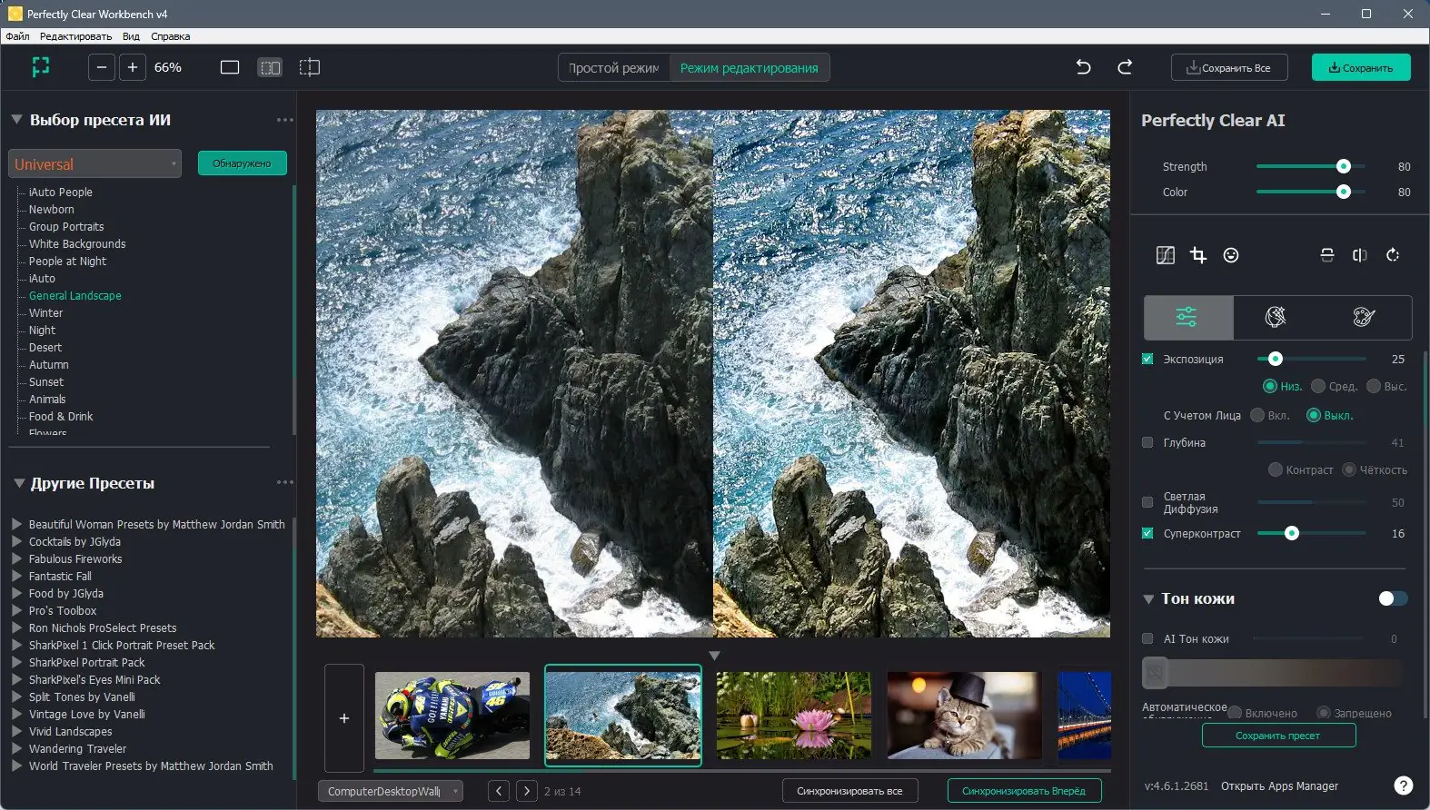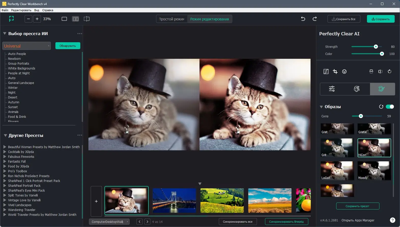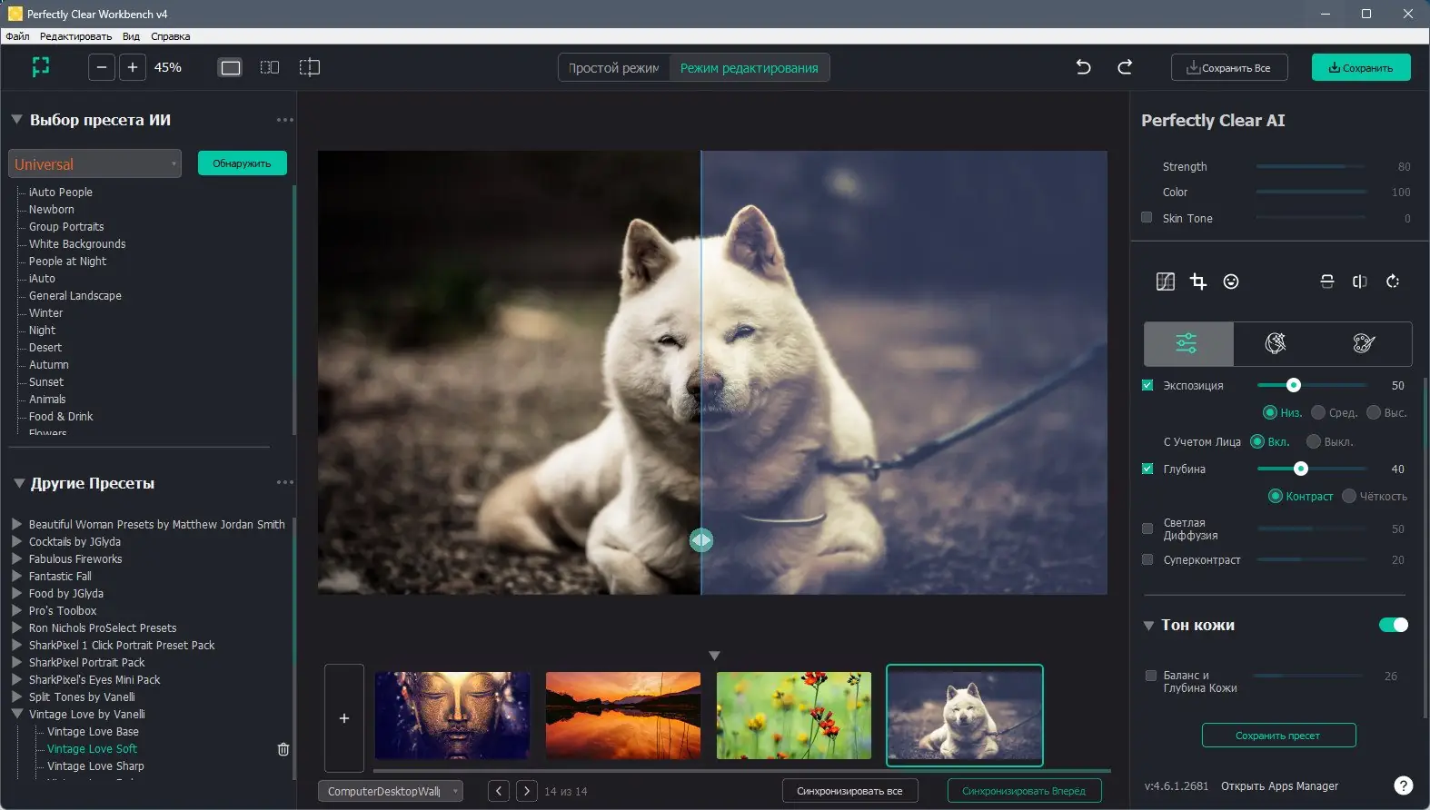 - Богатый набор пресетов, включая коллекции от ведущих фотографов и экспертов