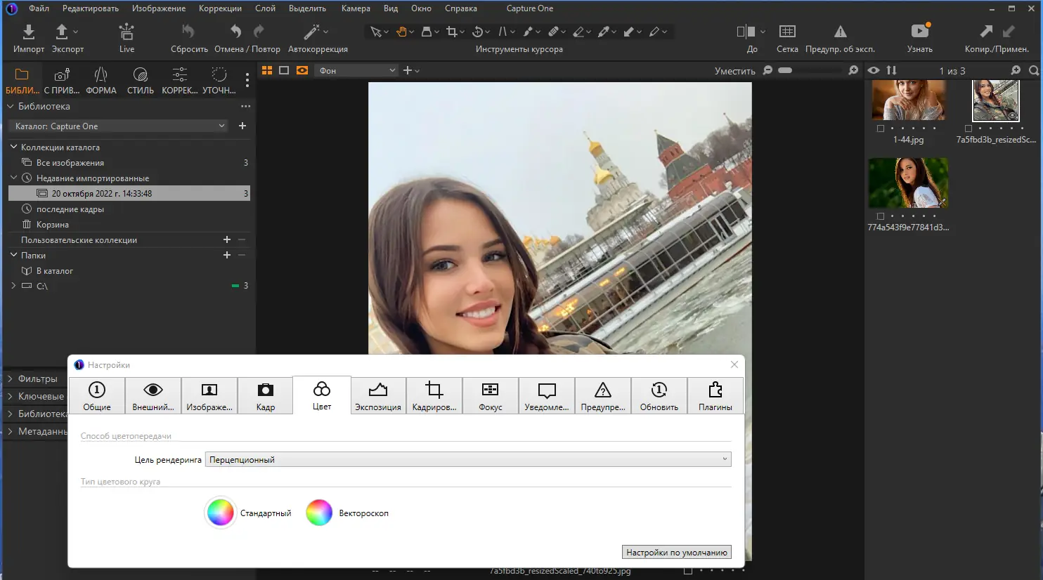 Интерфейс программы разделён на функциональные зоны, что упрощает навигацию при работе с большим количеством снимков. Импорт изображений сопровождается предпросмотром в реальном времени, а пакетная обработка позволяет применять заранее заданные настройки к группе файлов. Каждый RAW-файл можно экспортировать в несколько форматов одновременно, что экономит время при подготовке архивов. Цветокоррекция осуществляется с помощью гибких инструментов, включая круговую палитру для тонкой настройки оттенков и отдельную панель для коррекции цвета кожи, с возможностью сохранения пресетов. Устранение шумов выполняется по двум каналам — по яркости и по цвету, что позволяет гибко управлять качеством изображения. Поддержка ICC-профилей гарантирует точную цветопередачу на разных устройствах. Для камер Phase One и других брендов доступна функция прямого захвата изображений по кабелю или через Wi-Fi, что удобно при студийной съёмке. Дополнительно реализована функция оверлея для анализа композиции, а поддержка нескольких мониторов улучшает рабочий процесс при сложной постобработке. Редактор цвета позволяет выполнять раздельное тонирование — как глобально, так и с точечным применением через контрольные точки на фото.