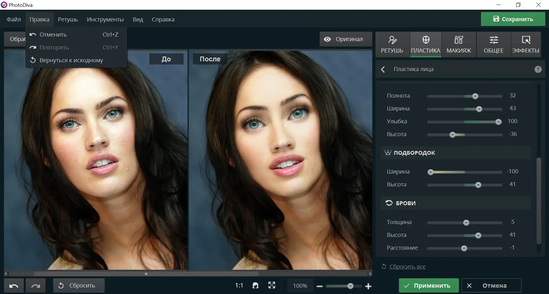 - Коррекция формы лица, глаз, носа и губ с помощью ползунков