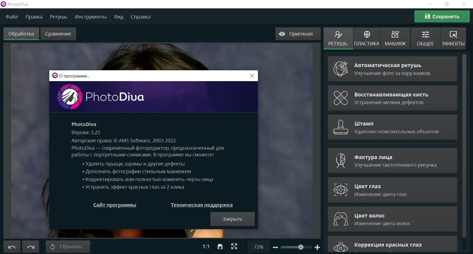 PhotoDiva — это специализированный инструмент для обработки портретной фотографии, разработанный с акцентом на удобство и скорость. В отличие от громоздких графических редакторов, требующих глубоких навыков, данная программа предлагает интуитивный интерфейс и автоматизированные режимы, позволяющие добиваться профессиональных результатов всего за несколько минут. Она идеально подойдёт для домашнего использования, коррекции селфи или подготовки фото для социальных сетей.