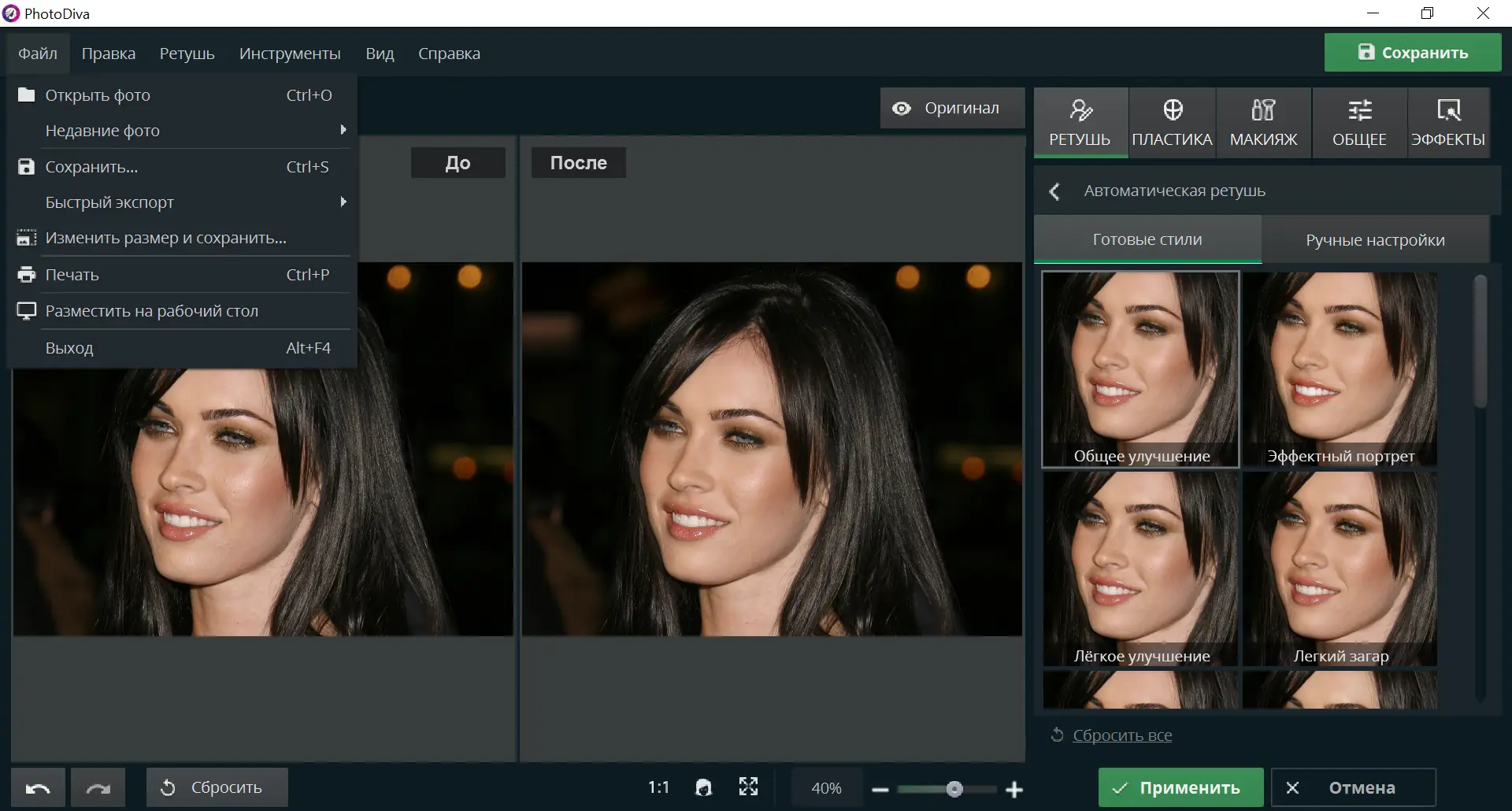 Программа эффективно справляется как с мелкими недостатками, так и с глобальной коррекцией внешности, сохраняя при этом естественность изображения.