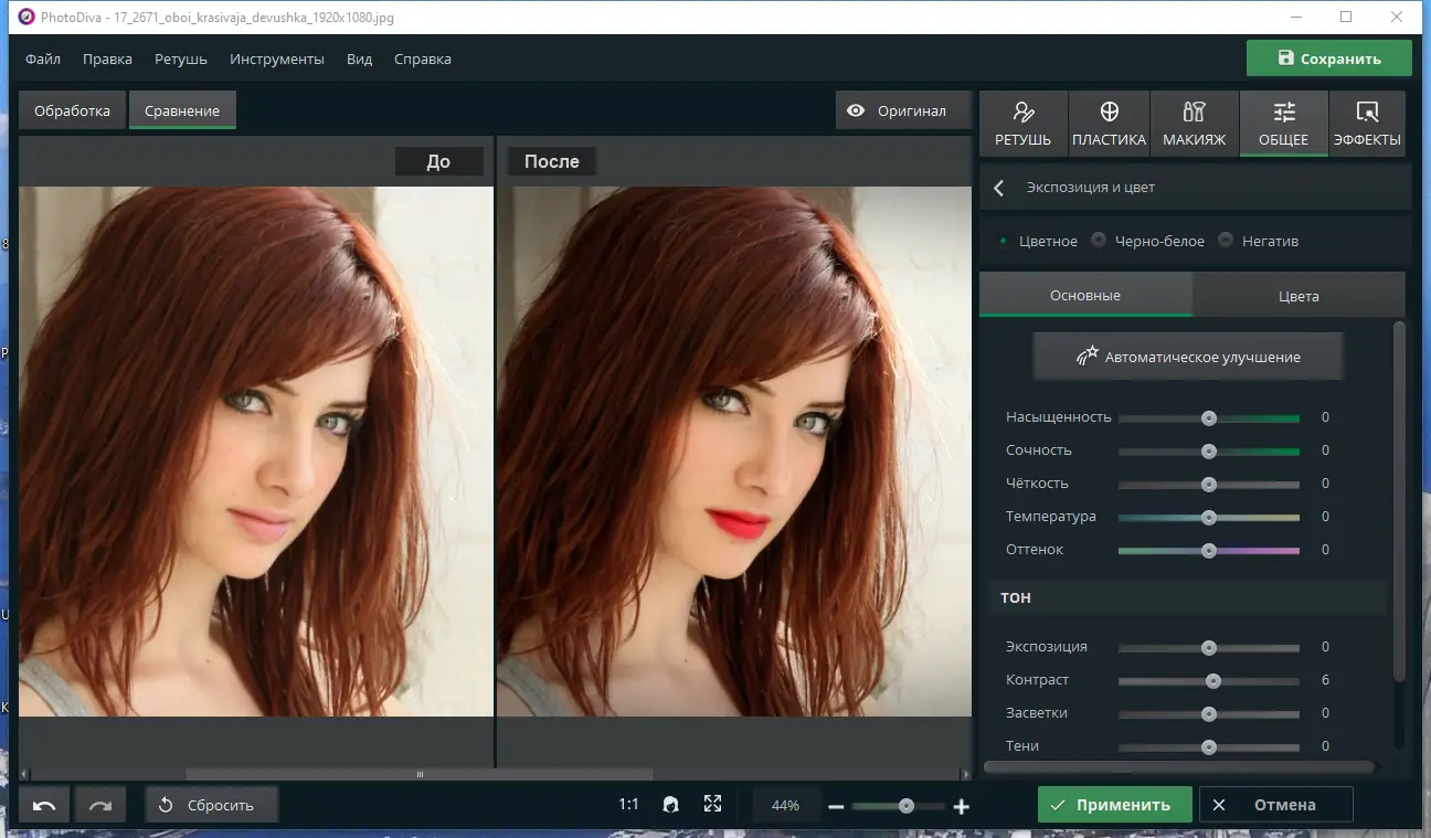 PhotoDiva — это фоторедактор для быстрой и качественной ретуши портретов, который подходит как новичкам, так и опытным пользователям. Программа автоматически распознаёт черты лица, устраняет дефекты кожи, корректирует пропорции лица и позволяет наносить виртуальный макияж. С её помощью можно мгновенно улучшить снимок, заменить фон и подчеркнуть выразительность взгляда.
