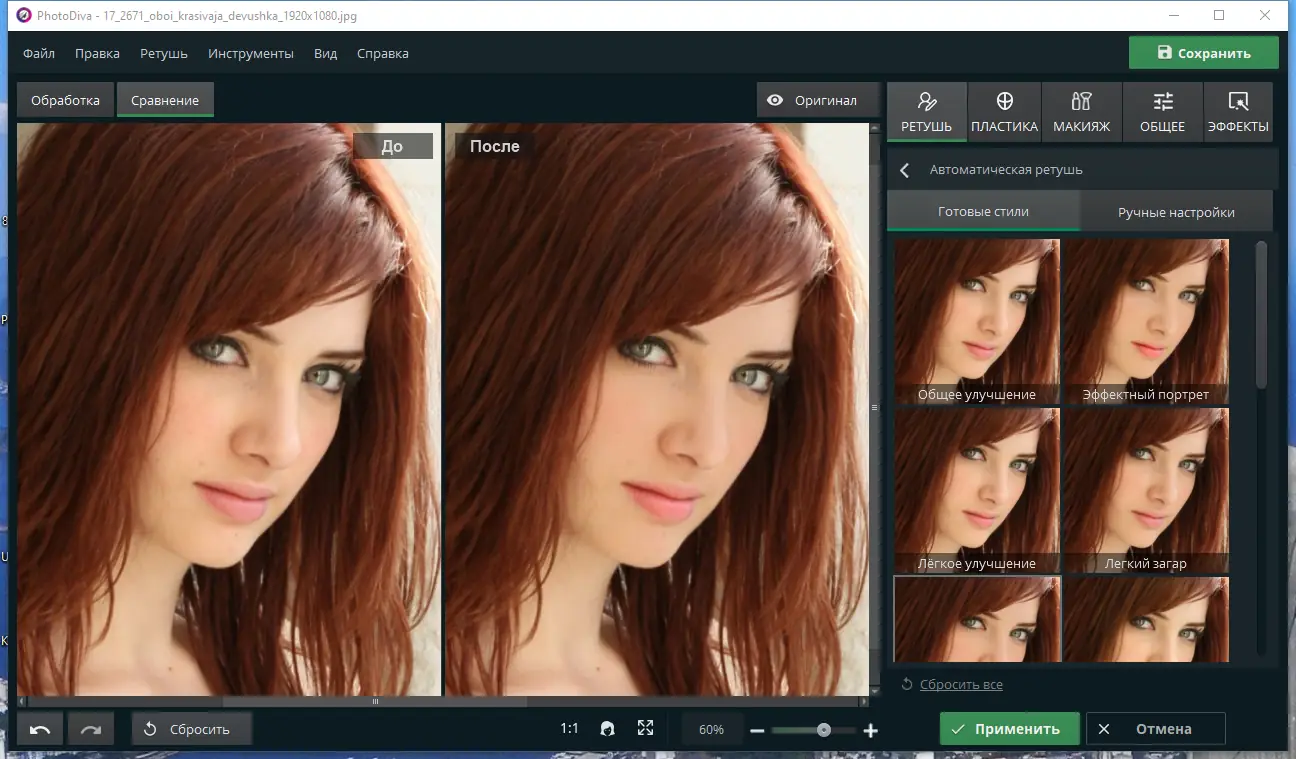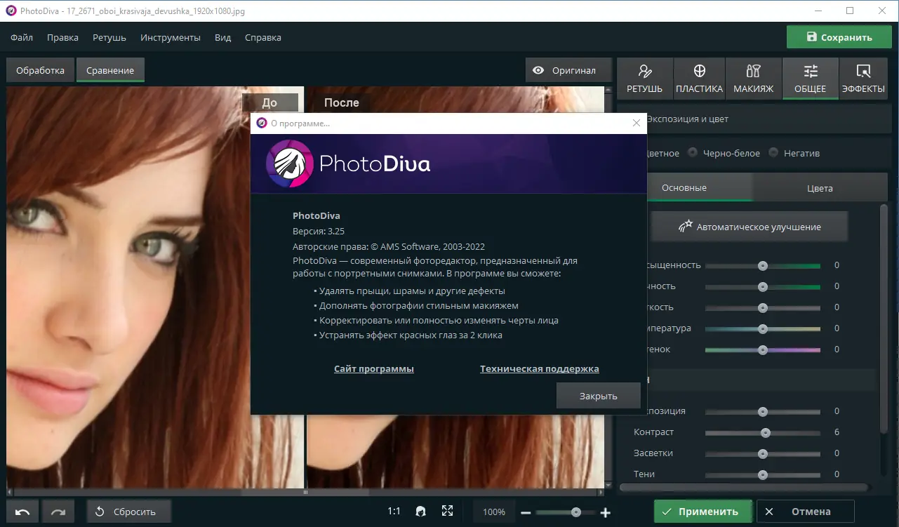 PhotoDiva — это специализированный инструмент для обработки портретной фотографии, созданный с акцентом на простоту и скорость. Он сочетает в себе автоматическую ретушь и тонкую ручную настройку, позволяя добиваться естественного результата без длительного изучения интерфейса. Программа идеально подходит для тех, кто хочет быстро улучшить внешний вид фотографий без использования сложных графических редакторов.