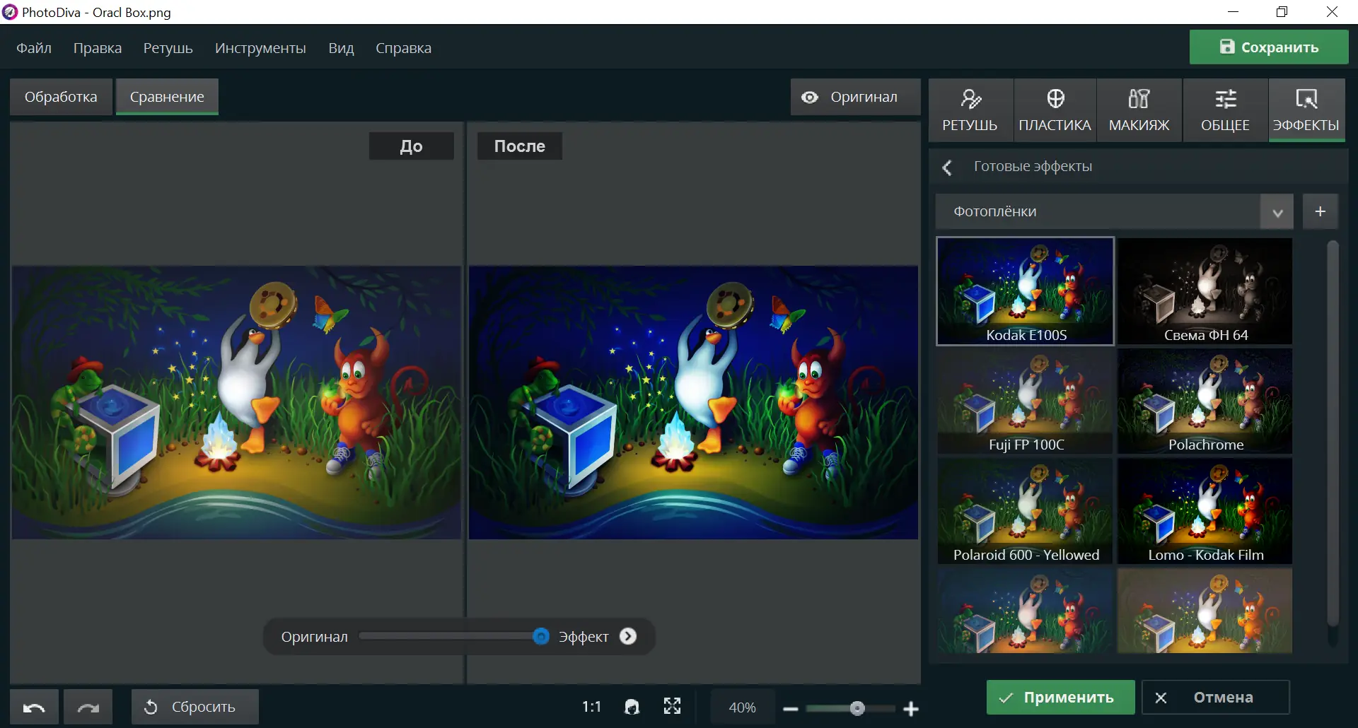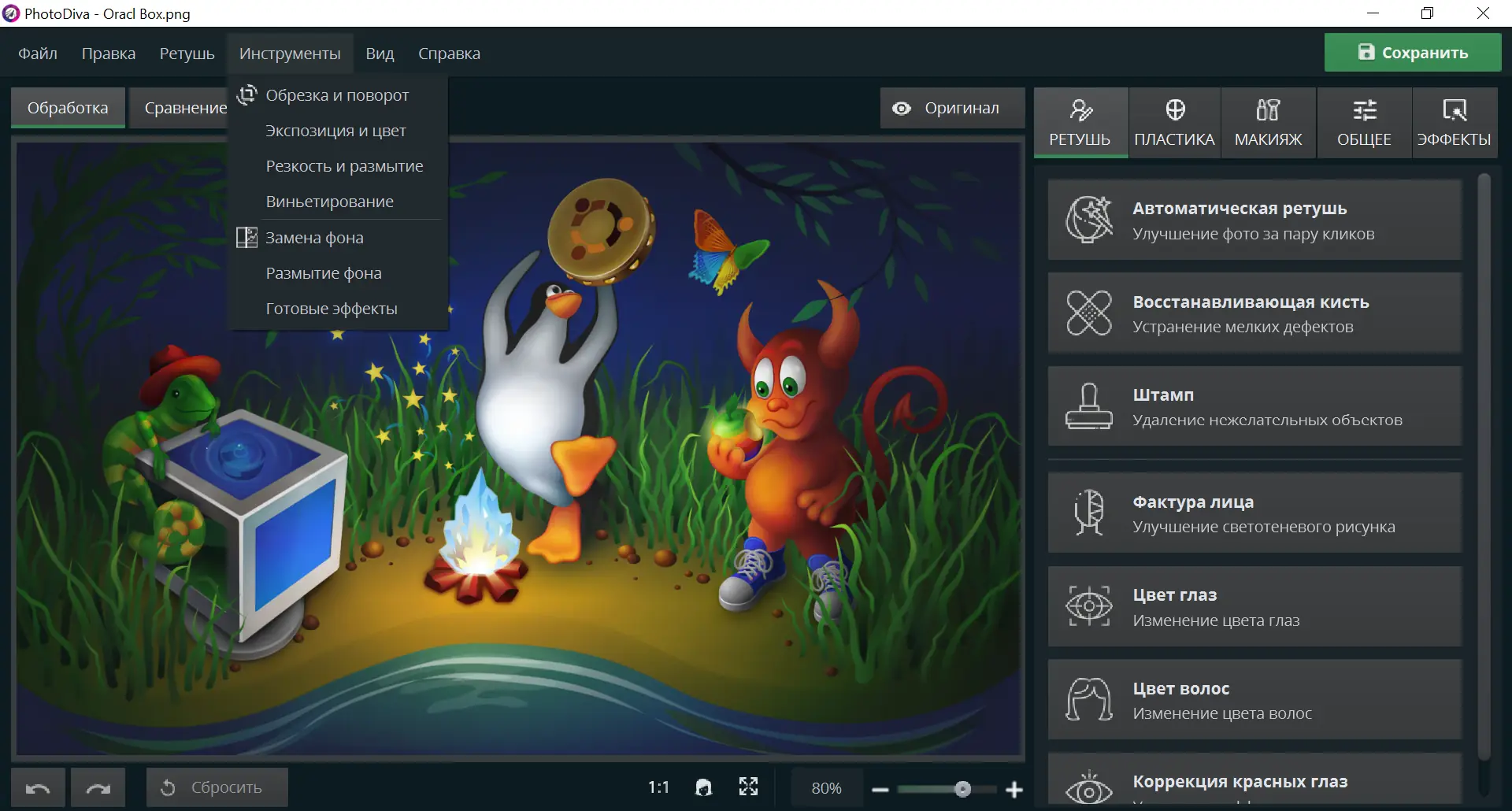 - Широкий набор инструментов: пластика, макияж, замена фона, цветокоррекция