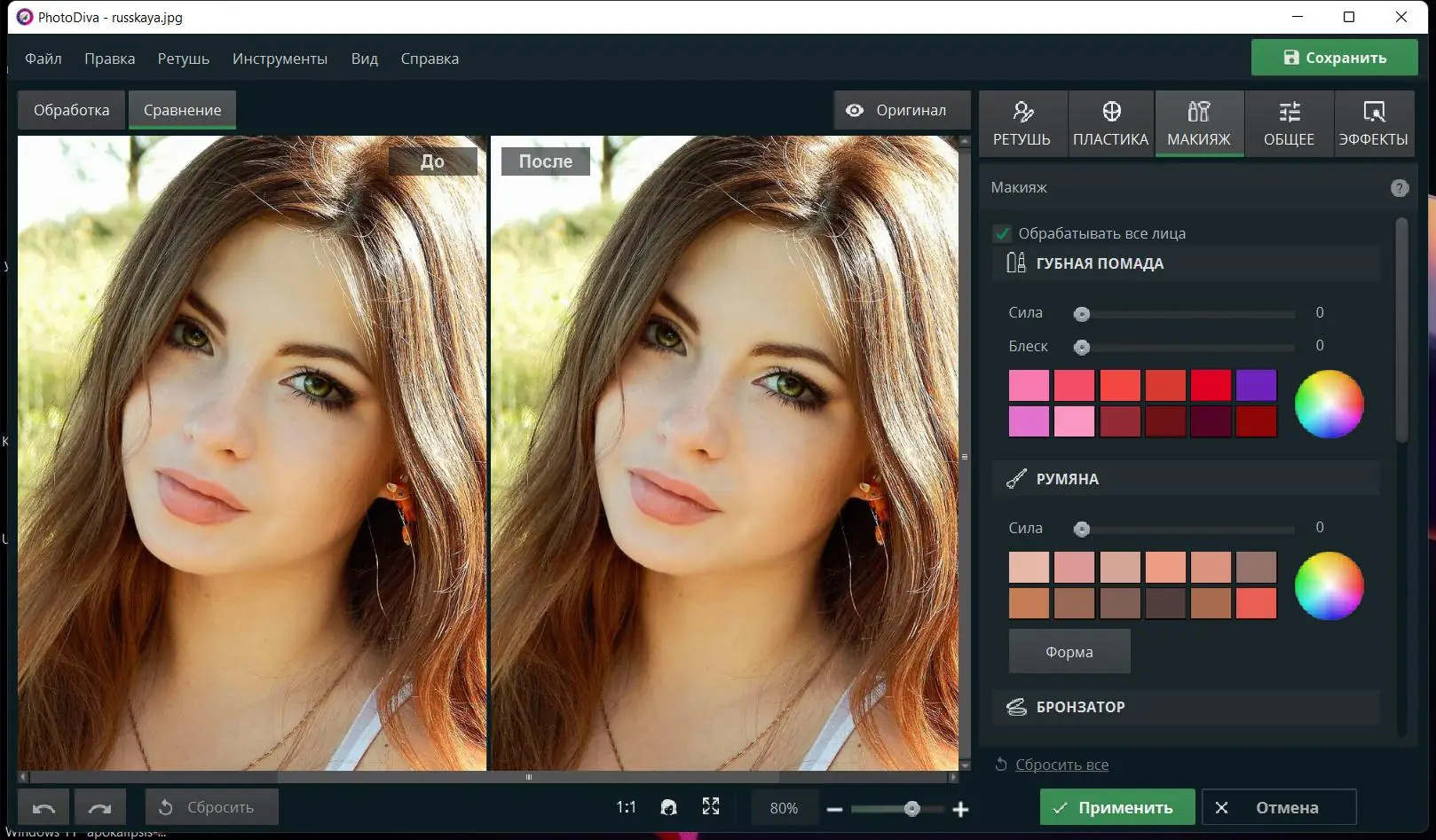 - Нанесение виртуального макияжа: тени, помада, румяна, хайлайтер