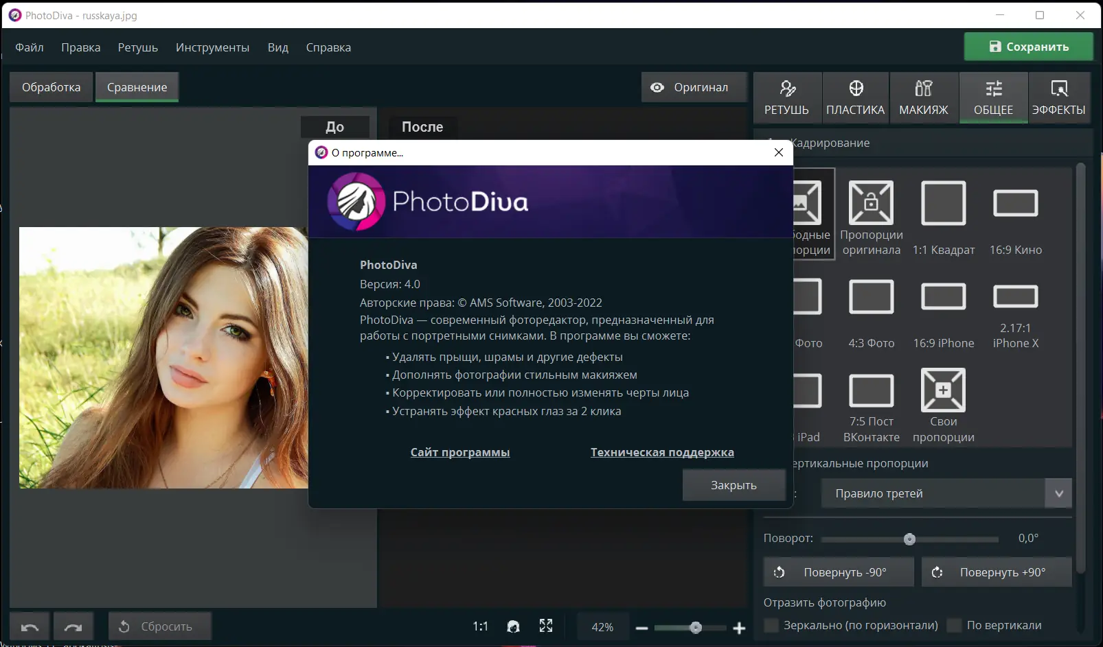 PhotoDiva — это специализированный инструмент для обработки портретных фотографий, разработанный с учётом потребностей как любителей, так и начинающих профессионалов. Программа сочетает в себе простоту использования и мощные функции ретуши, позволяя добиваться впечатляющих результатов без необходимости изучать сложные техники. Она эффективно справляется с мелкими несовершенствами и более серьёзными визуальными недостатками на снимках.