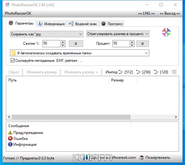 PhotoResizerOK доступна для бесплатного скачивания в портативной версии, совместимой с современными версиями Windows. Программа не требует сложной настройки и готова к использованию сразу после запуска.
