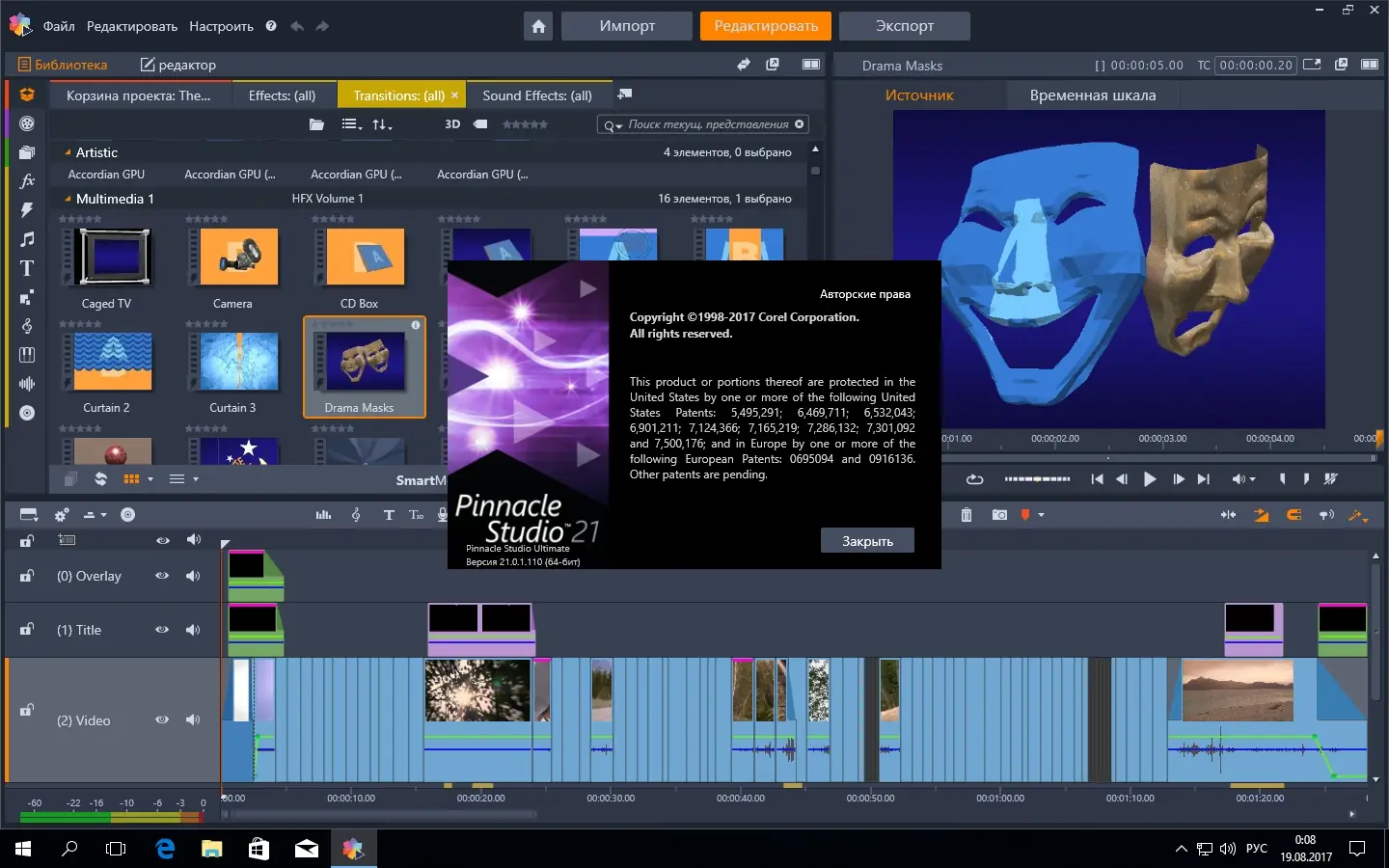 - Богатая коллекция эффектов, переходов, титров и аудиовизуального контента, включая более 2000 элементов.