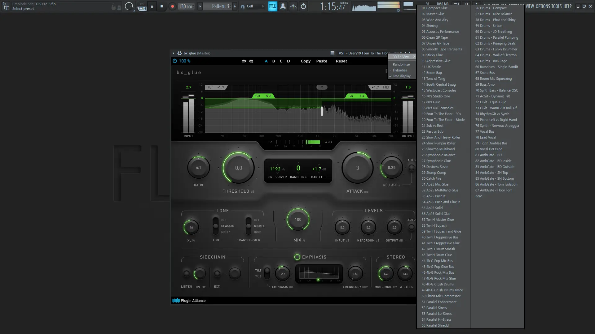 Использование bx_glue начинается с выбора режима сжатия: двухполосного или классического. В двухполосном режиме можно настроить кроссовер и отдельно регулировать динамику в каждом диапазоне, что особенно полезно при работе с барабанами или вокалом. Параметр Band Tilt позволяет одновременно поднять одну полосу и опустить другую, упрощая балансировку без дополнительного эквализатора. Для сведения всего микса используется режим 100% Band Link, при котором компрессор работает как традиционный bus-компрессор. Автоматическое управление усилением помогает проводить честные A/B-сравнения. Сайдчейн поддерживает смесь внутреннего и внешнего сигнала, расширяя возможности динамической обработки.