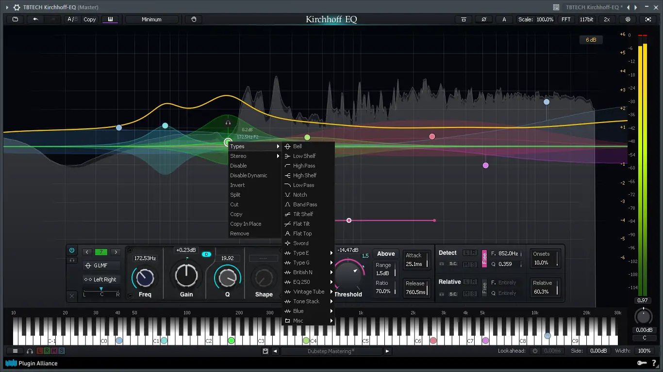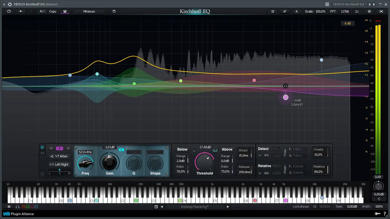 Plugin Alliance & TBTECH Kirchhoff-EQ — это высокоточный 32-полосный параметрический эквалайзер, разработанный для профессионального сведения и мастеринга. Программа сочетает в себе точность цифровой обработки и характерное звучание аналоговых устройств, предлагая широкий выбор фильтров, режимов фазы и динамической обработки с минимальным уровнем искажений. Его архитектура обеспечивает исключительную точность и гибкость при работе с частотным спектром.