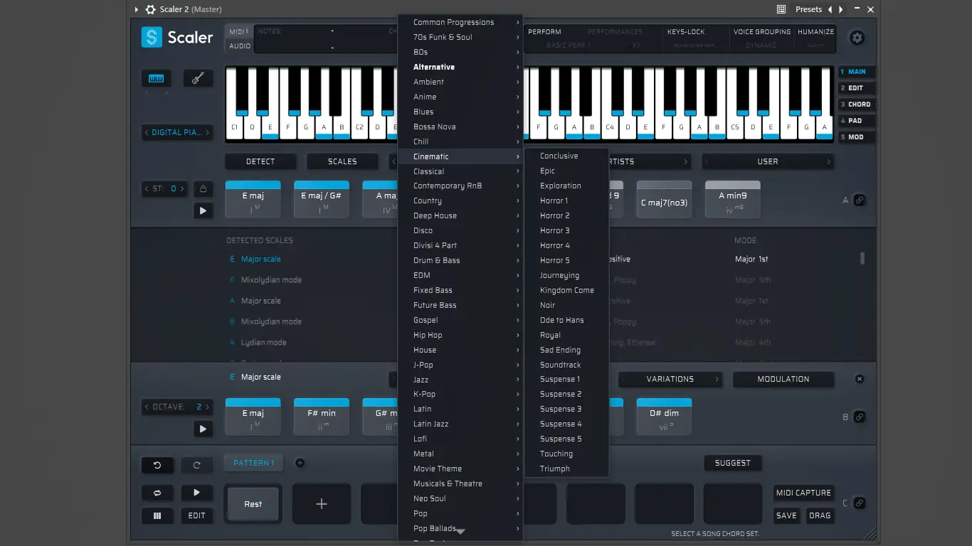 Scaler представляет собой программу для создания музыки, ориентированную на работу с гармонией и структурой композиций. Она автоматически определяет текущую тональность по входящим нотам, будь то через MIDI-контроллер или аудиосигнал, и предлагает подходящие аккорды из своей обширной библиотеки. Свыше 1700 гамм, включая этнические, джазовые, классические и современные жанровые вариации, обеспечивают широкий спектр возможностей для экспериментов. Программа особенно полезна при написании песен, когда важно быстро находить вдохновляющие последовательности.