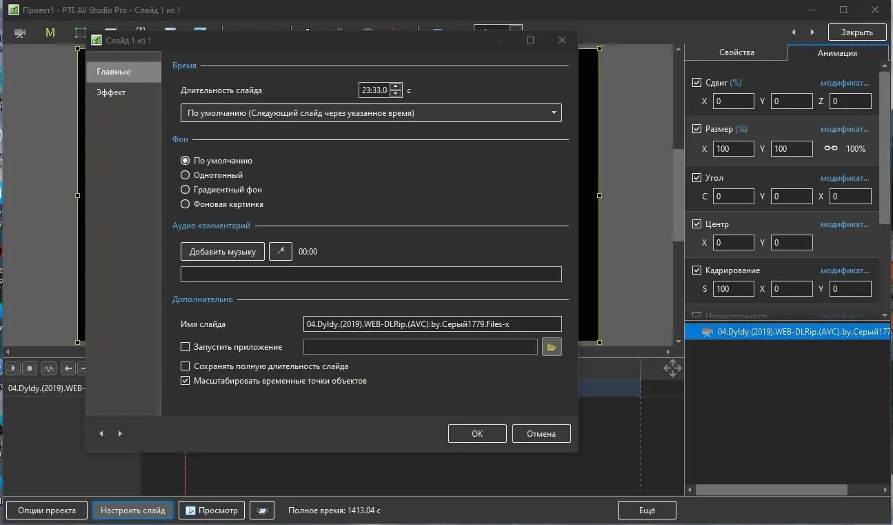 Каждый слайд можно настроить индивидуально, добавляя текст, звук, анимацию и визуальные эффекты, такие как приближение, отдаление или вращение изображения.