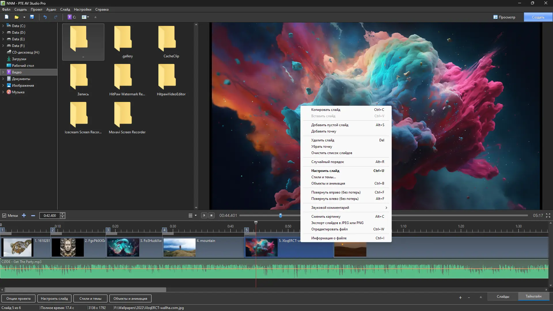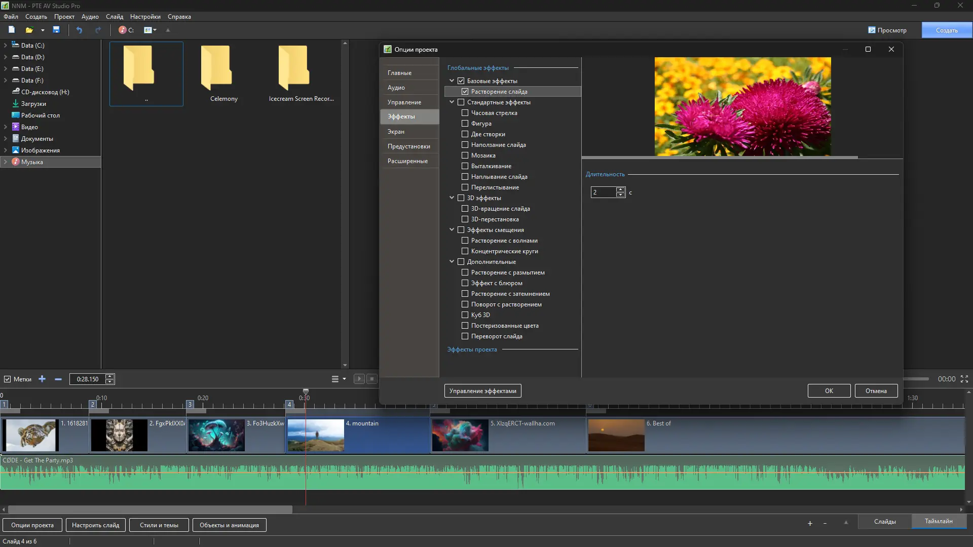 - Удобная синхронизация музыки и слайдов, возможность наложения нескольких аудиодорожек.