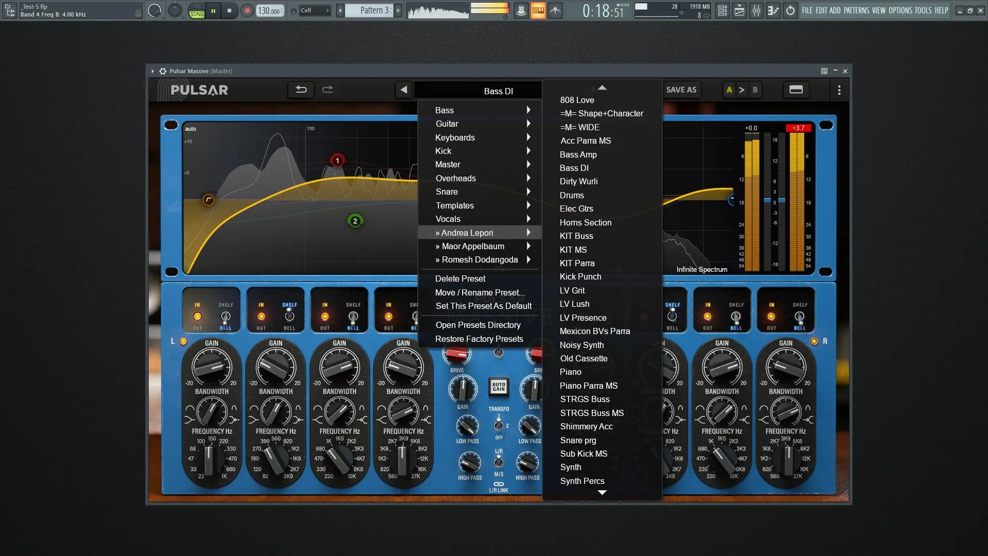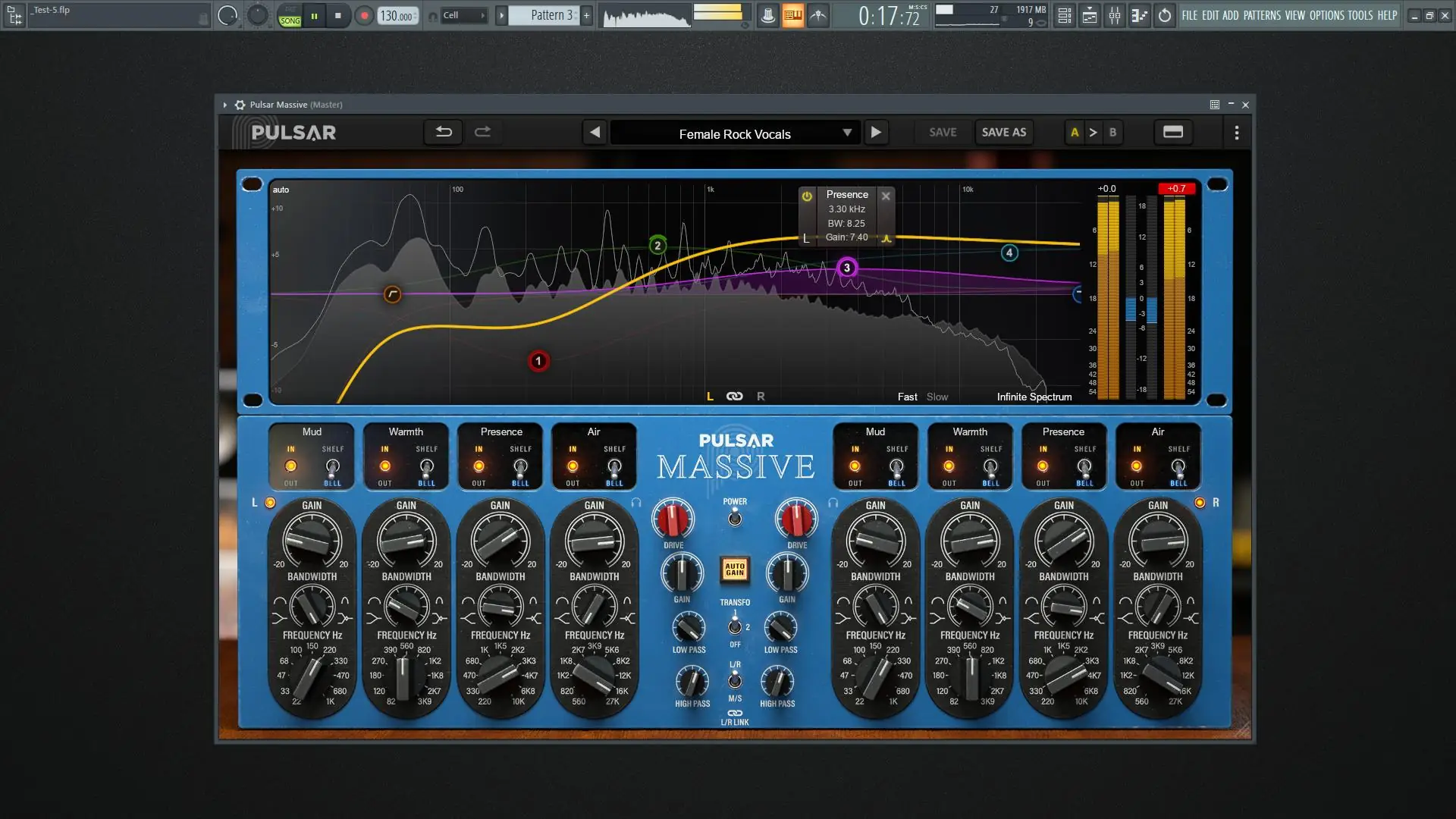 Интерфейс Pulsar Massive интуитивно понятен и отражает физическую компоновку оригинального устройства. Каждая полоса эквализации управляется с помощью крупных ручек, а визуальная кривая отображается в центре экрана, позволяя быстро оценить общее воздействие. Благодаря параллельной топологии изменения в одной полосе мягко влияют на другие, что делает процесс настройки более органичным. Пользователь может включить режим Auto-Gain, который автоматически компенсирует уровень при подъёме или спаде частот, сохраняя объективность сравнения. Режим привода даёт возможность усилить эффект насыщения, особенно заметный при работе с низкими частотами. Встроенный анализатор спектра работает в реальном времени, отображая как мгновенные, так и усреднённые данные, что помогает точно определять резонансы и дисбалансы. Режим M/S позволяет обрабатывать центральный и боковой каналы независимо, что особенно полезно при работе со стереоизображением.