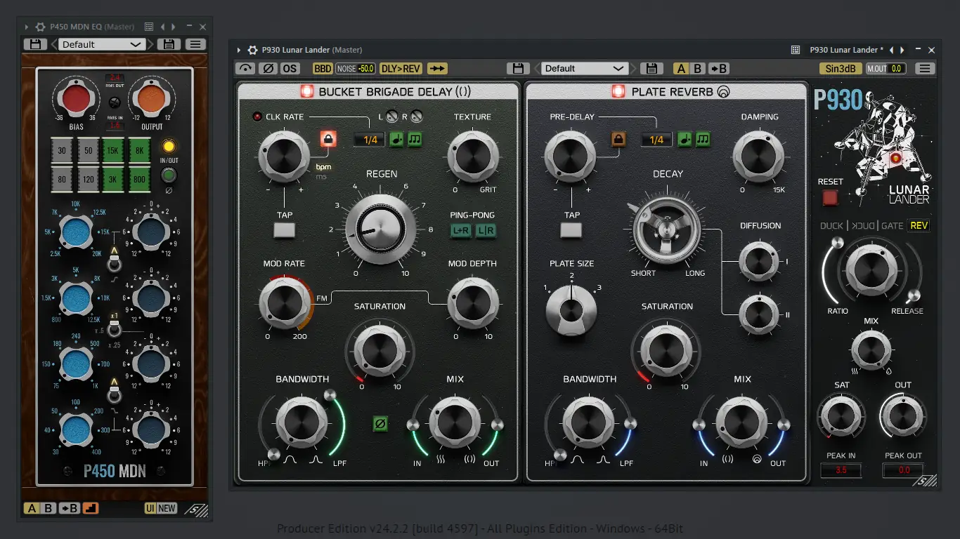 - P930 Lunar Lander комбинирует алгоритмическую реверберацию и задержку с насыщением, обеспечивая глубокую интеграцию звука в микс.