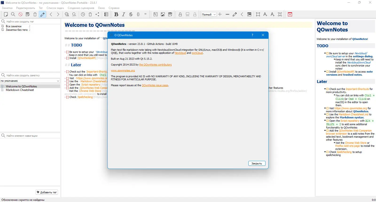 QOwnNotes — это надёжное решение для тех, кто ищет простой и эффективный способ ведения заметок с возможностью синхронизации и переноса данных между устройствами. Программа регулярно обновляется, получает новые языковые пакеты и улучшения в функциональности, включая поддержку последних версий операционных систем и библиотек. В версии 23.8.1 добавлен репозиторий для Debian Linux 12.0, обновлены пути для переводов при сборке под Qt6, а также расширена локализация за счёт вклада сообщества. Портативная версия доступна для запуска через файл QOwnNotesPortable.bat, что делает её удобной для использования на любом компьютере.