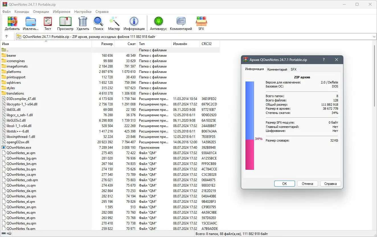 QOwnNotes доступен для скачивания в стандартной и портативной версии. Портативная сборка не требует установки и запускается через файл QOwnNotesPortable.bat, что делает её удобной для использования на разных компьютерах без внесения изменений в систему. Архив с портативной версией имеет высокую степень сжатия, а его целостность можно проверить по контрольным хэшам: CRC32, MD5 и SHA-1. Программа совместима с современными версиями Windows и поддерживает русский язык интерфейса.