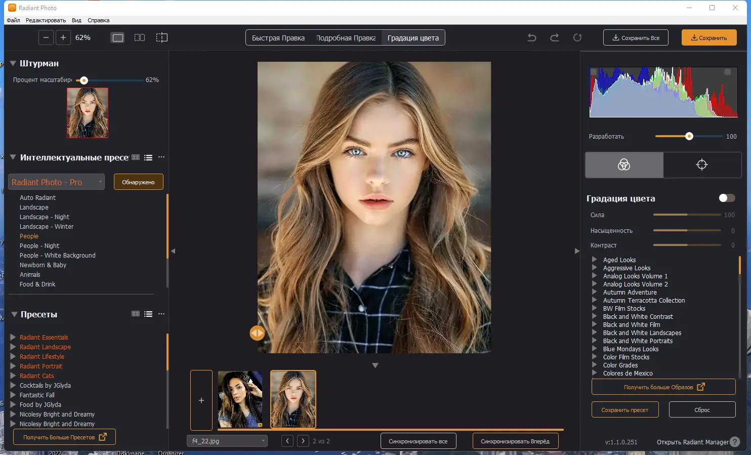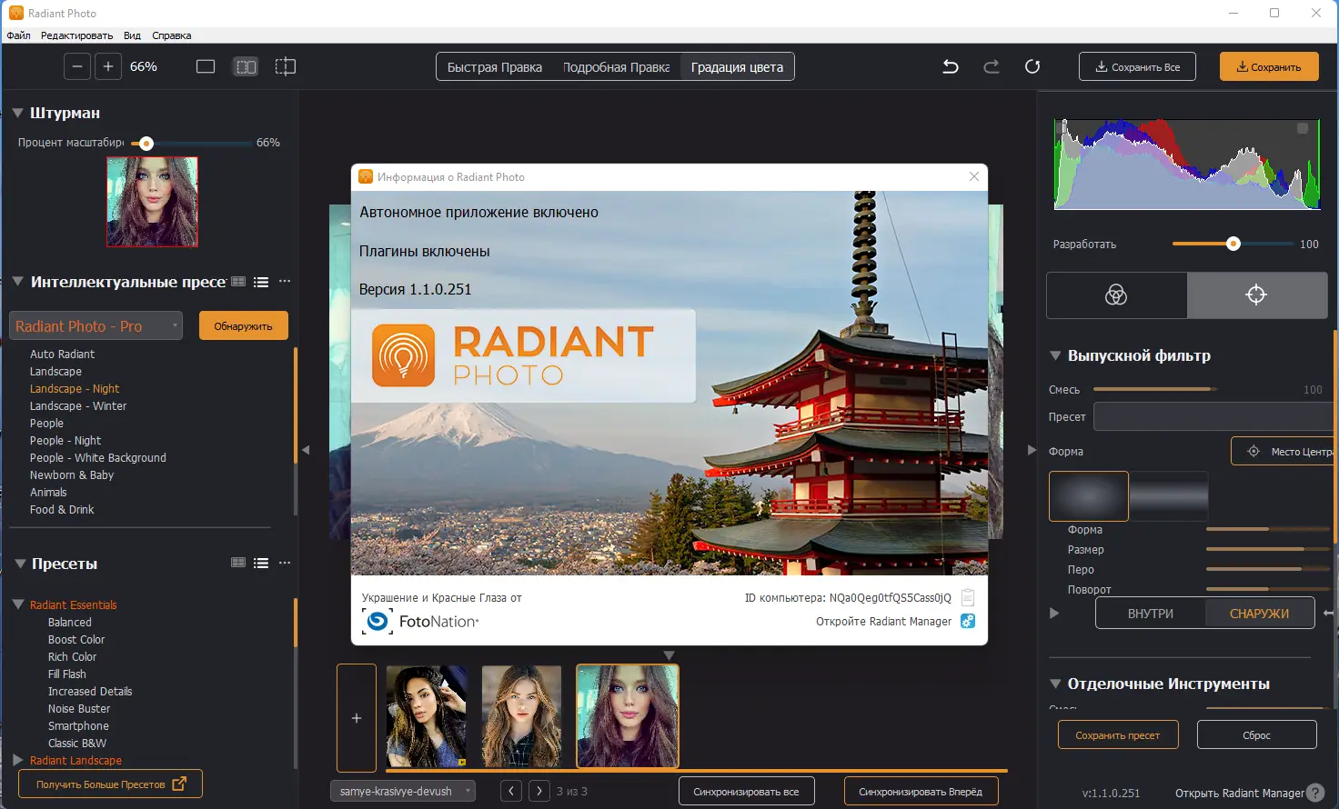 Radiant Photo, ранее известная как Perfectly Clear Complete, представляет собой современный редактор изображений, ориентированный как на любителей, так и на профессиональных фотографов. Программа позволяет выполнять комплексную обработку снимков, сохраняя при этом детали и обеспечивая естественный внешний вид конечного результата. Основное внимание уделяется автоматической коррекции экспозиции, баланса белого, контраста и цветовой насыщенности без необходимости вручную настраивать десятки параметров.