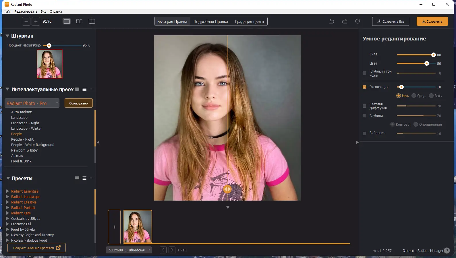 Radiant Photo — это современное программное обеспечение для редактирования цифровых фото, созданное на основе технологии Perfectly Clear Complete. Оно помогает автоматически улучшать снимки, корректируя баланс белого, экспозицию, контраст и насыщенность без потери качества. Программа поддерживает как самостоятельную работу, так и интеграцию в виде плагина для Adobe Photoshop и Lightroom, расширяя функциональность профессиональных графических редакторов. Работа с RAW-файлами и неразрушающее редактирование позволяют сохранять исходные данные изображения, возвращаясь к любому этапу обработки.