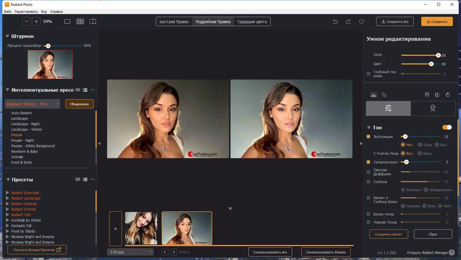 Radiant Photo — это мощный инструмент для редактирования изображений, разработанный для автоматического улучшения фотографий с высокой точностью и сохранением естественных деталей. Программа сочетает в себе продвинутые алгоритмы коррекции цвета, экспозиции и резкости, работая как автономное приложение или как плагин для Photoshop и Lightroom. Она поддерживает RAW-форматы, обеспечивает неразрушающее редактирование и предлагает обширную библиотеку пресетов для быстрой обработки снимков.