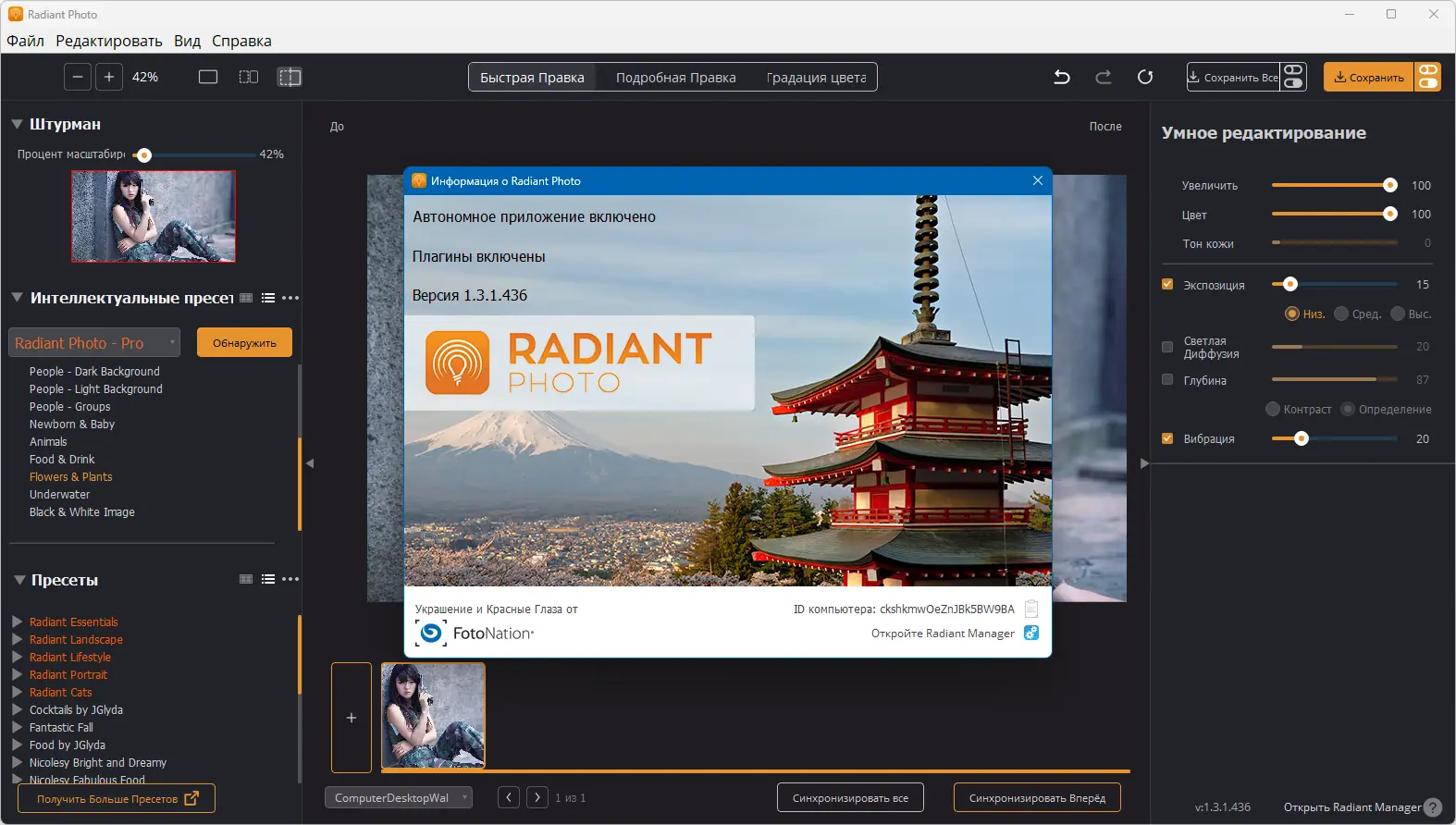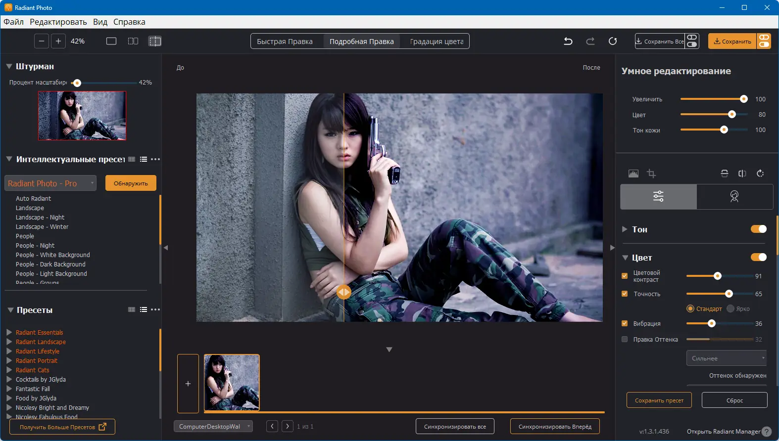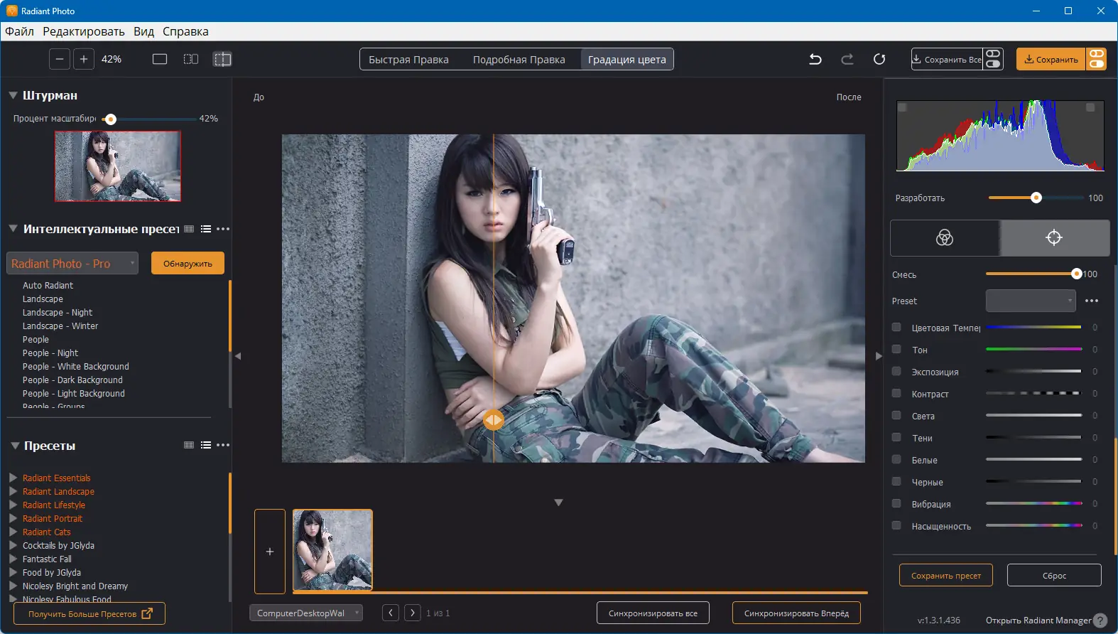 Radiant Photo представляет собой многофункциональное приложение для обработки фотографий, разработанное с акцентом на качество, скорость и удобство. Оно позволяет не только редактировать отдельные параметры изображений, такие как экспозиция, баланс белого, насыщенность и контраст, но и управлять коллекциями снимков с помощью тегов, альбомов и поиска по метаданным. Поддержка RAW-форматов делает его незаменимым помощником для фотографов, использующих зеркальные или беззеркальные камеры. Программа может использоваться как автономное приложение или как плагин для Photoshop и Lightroom, расширяя функционал профессиональных графических редакторов.