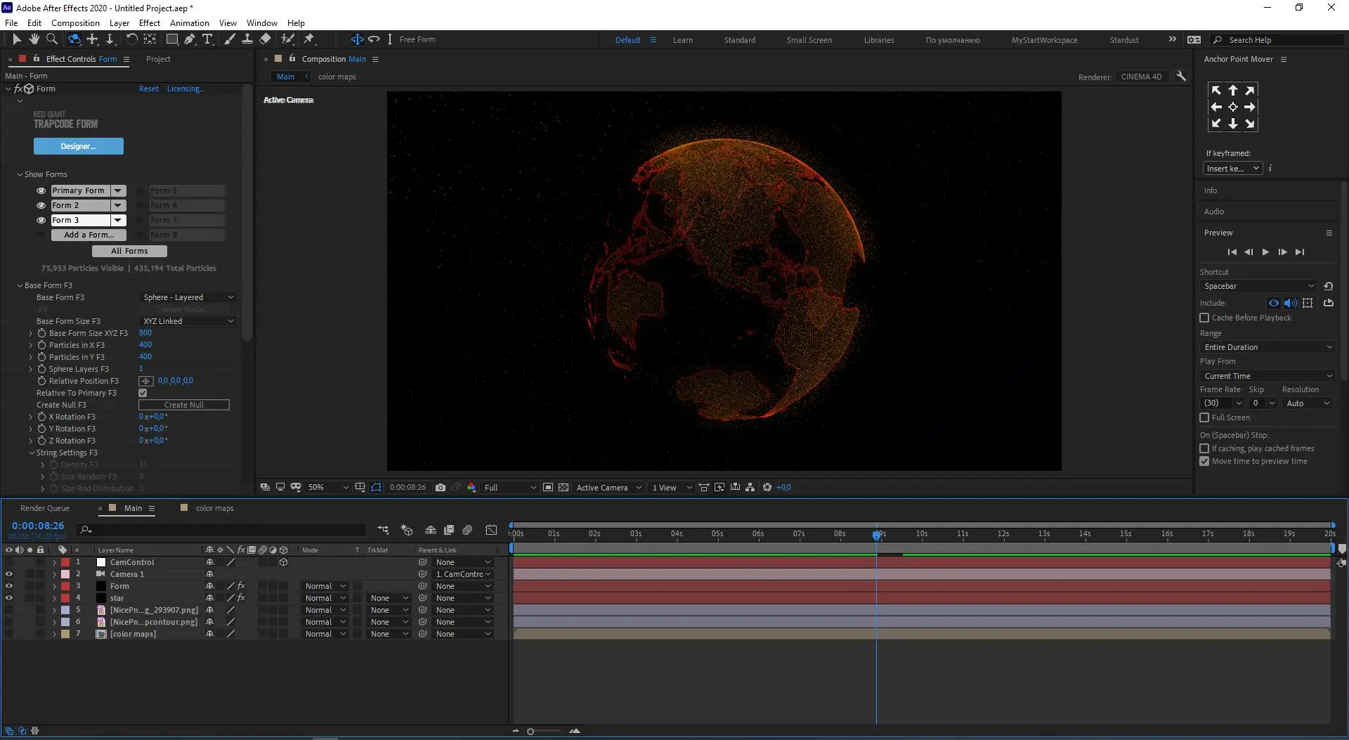 - Trapcode Form — создание 3D-сеток на основе точек, идеально подходит для анимированных фонов.