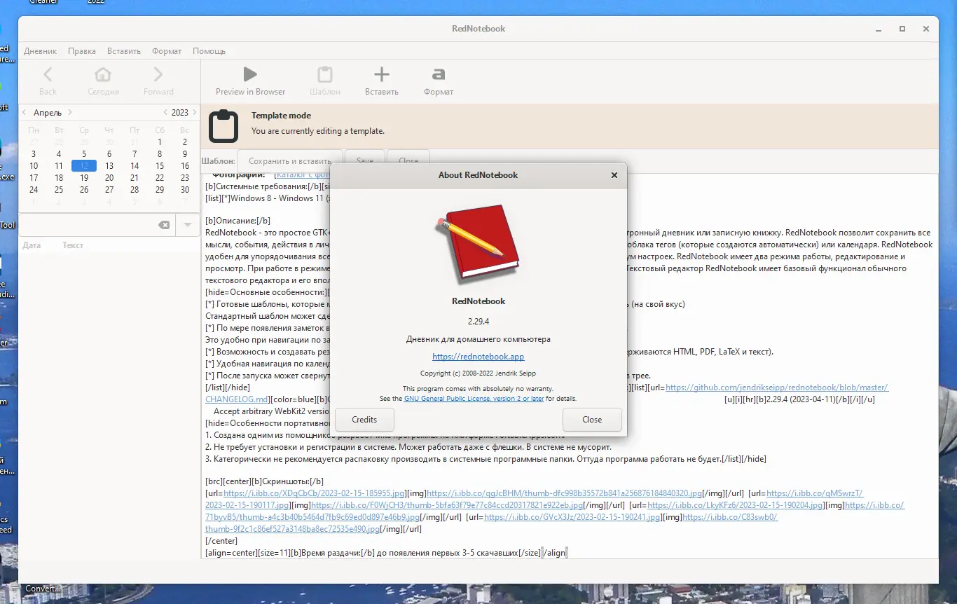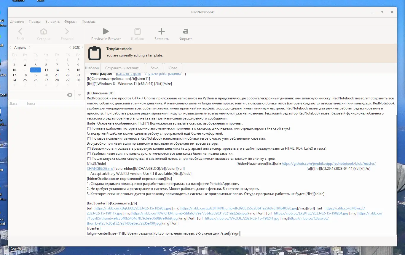 RedNotebook — это легковесный электронный дневник с открытым исходным кодом, разработанный на Python с использованием библиотеки GTK+. Программа помогает вести персональные записи, фиксировать идеи и события, организовывать повседневные задачи. Интерфейс интуитивно понятен, а встроенные функции упрощают навигацию и поиск по записям. Поддержка тегов, календаря и экспорт в различные форматы делают приложение универсальным инструментом для ведения заметок.