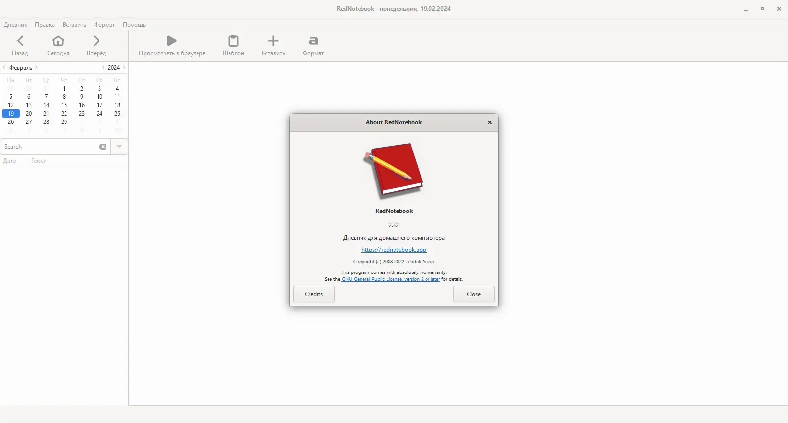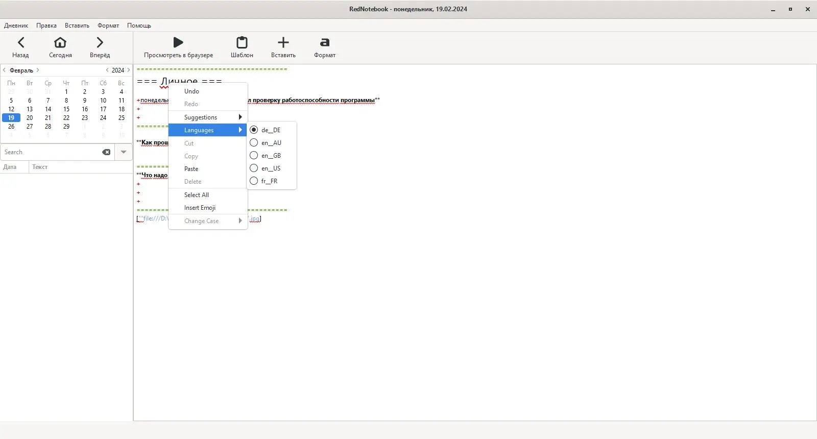 Программа RedNotebook представляет собой легковесное приложение для ведения цифрового дневника, разработанное в рамках экосистемы Gnome. Она не требует сложной настройки и сразу готова к использованию после установки. Интерфейс разделён на две основные части: редактирование и просмотр записей, что упрощает процесс работы с текстом без лишних отвлекающих элементов.