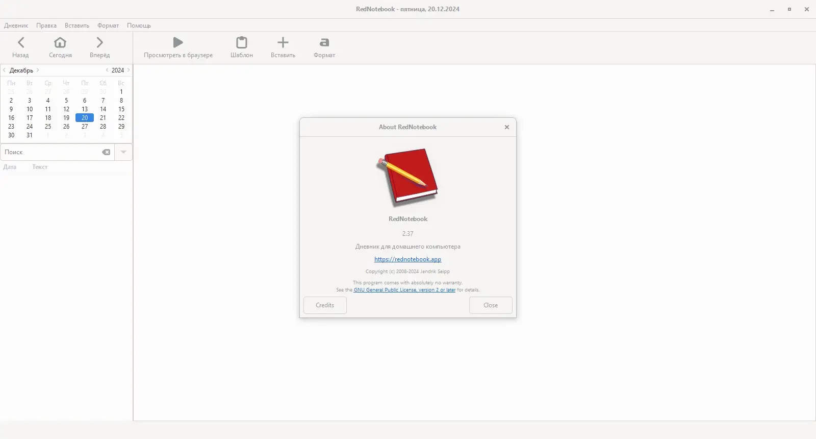 RedNotebook — это удобный электронный дневник с открытым исходным кодом, разработанный на базе Python и GTK+, который помогает вести записи, фиксировать события и систематизировать повседневные мысли. Программа предлагает простой интерфейс, поддержку тегов, шаблонов и экспорт в различные форматы, обеспечивая комфортную работу с личной информацией.