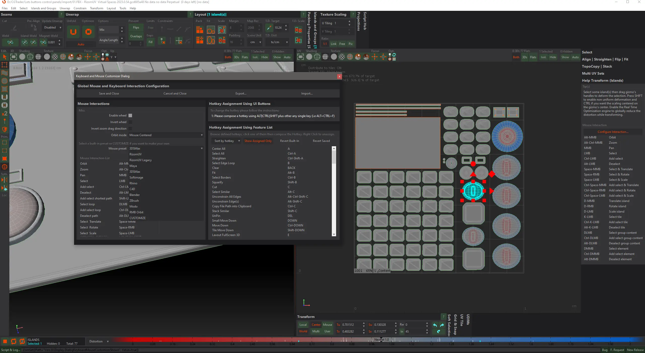 Использование RizomUV начинается с импорта 3D-модели в поддерживаемом формате. После загрузки модель можно быстро развернуть с помощью автоматических инструментов, таких как Magic Wand с новым режимом Auto-Unfold. Далее доступны операции масштабирования, упаковки и оптимизации островов по осям U и V независимо. Пользователь может настраивать поведение мыши, цвет интерфейса и параметры сетки, адаптируя программу под свои нужды. Экспорт текстур выполняется через модуль Stamper с возможностью сохранения в PNG и настройкой разрешения.