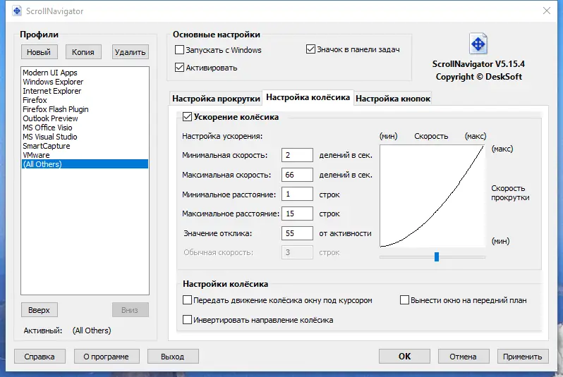 - Гибкие параметры динамического ускорения колеса мыши, настраиваемые под стиль работы