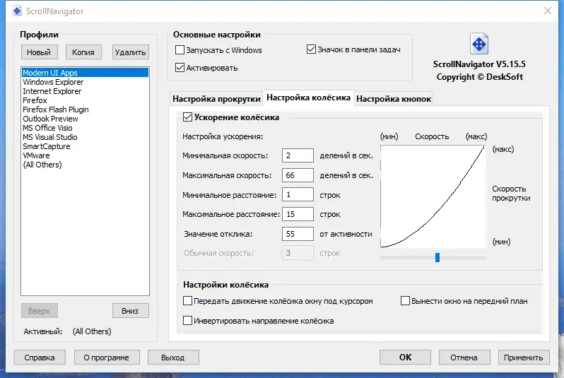 - Динамическое ускорение колеса мыши для более точного или быстрого скроллинга