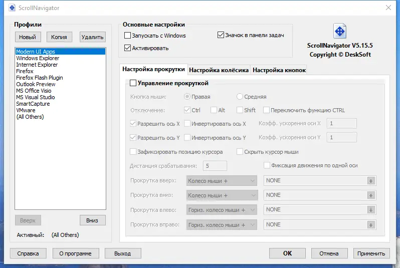 После установки ScrollNavigator начинает работать в фоне и не требует дополнительных запусков. Для активации двумерной прокрутки удерживайте правую кнопку мыши и перемещайте курсор вверх, вниз, влево или вправо. Направление движения курсора определяет направление прокрутки. Колесо мыши продолжает функционировать в обычном режиме, но с добавленной возможностью динамического ускорения — чем быстрее вы крутите колесо, тем дальше перемещается контент. Чтобы временно отключить поведение программы, достаточно нажать клавишу Ctrl. Все действия можно настроить в интерфейсе утилиты, включая чувствительность, поведение кнопок мыши и условия активации.