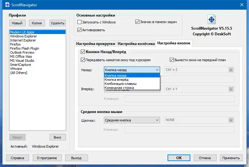 - Настраиваемые действия для кнопок «вперед», «назад» и средней кнопки мыши