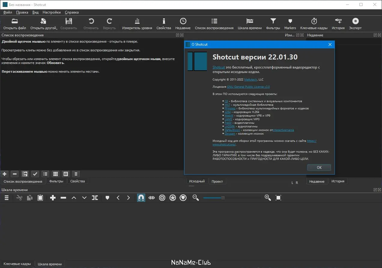 Shotcut представляет собой универсальную программу для монтажа, разработанную для обработки видеоданных на профессиональном уровне. Она функционирует на базе фреймворка MLT и поддерживает широкий диапазон аудио- и видеоформатов без необходимости установки дополнительных кодеков. Программа активно используется как новичками, так и опытными монтажерами благодаря своей стабильности и гибкости. Она не требует регистрации и доступна для использования сразу после запуска. Shotcut поддерживает работу с проектами, сохранёнными в формате MLT XML, что упрощает обмен между пользователями.