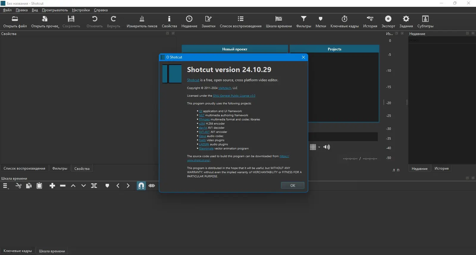 Shotcut представляет собой универсальное решение для обработки цифрового видео, подходящее как для новичков, так и для опытных пользователей. Программа позволяет редактировать видеоролики, настраивать цветокоррекцию, изменять громкость звука, применять эффекты и фильтры, а также работать с различными кодеками и форматами. Поддержка многопоточности и аппаратного ускорения делает процесс монтажа более плавным и производительным.