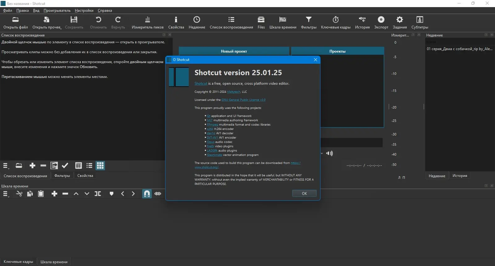 Shotcut — это мощная программа для монтажа, разработанная с открытым исходным кодом, что обеспечивает её прозрачность, стабильность и активное развитие сообществом. Она предназначена для обработки видеофайлов, настройки аудиодорожек, применения фильтров и преобразования контента в различные форматы без потери качества.