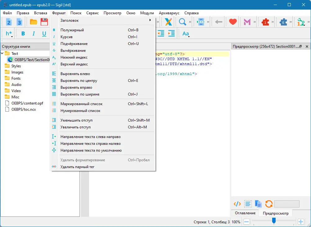 - Возможность редактирования EPUB-файлов с поддержкой HTML и XHTML