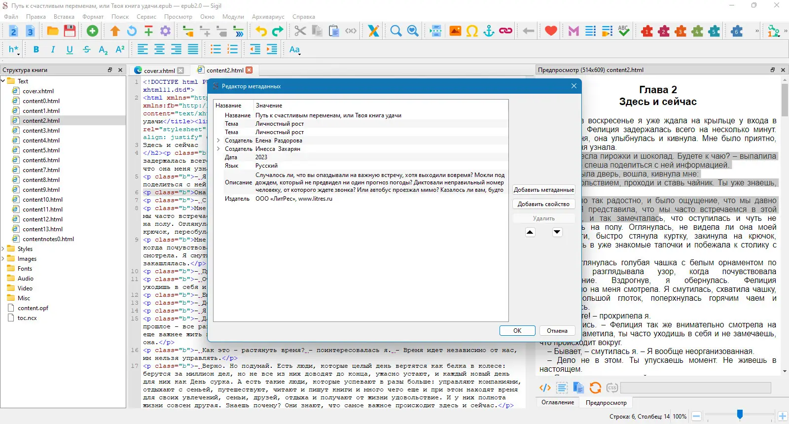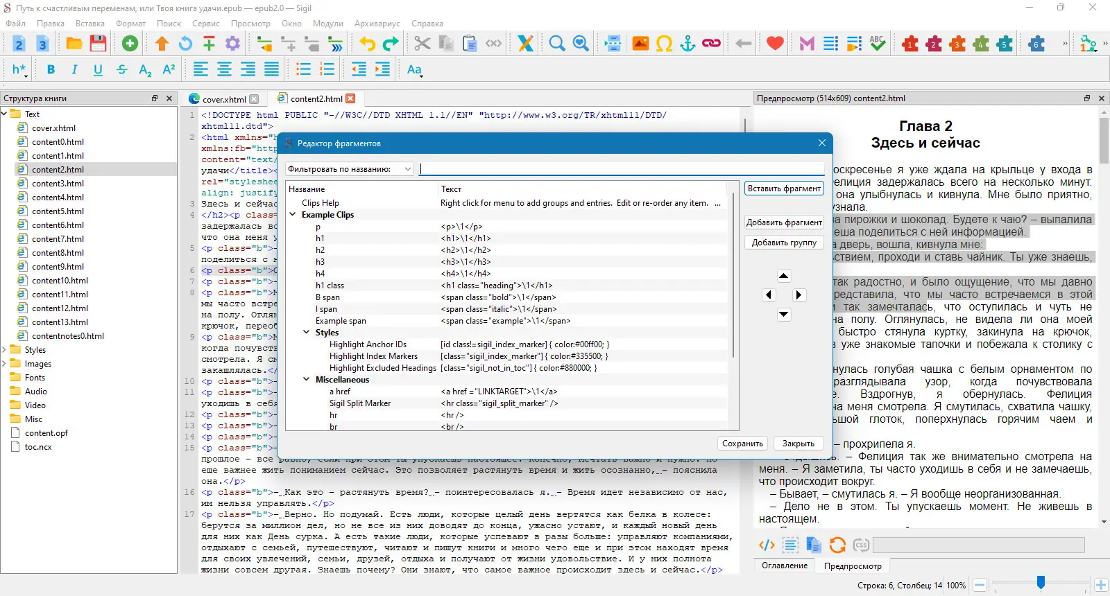 Программа сочетает в себе функциональность текстового процессора и инструмента для вёрстки, что делает её незаменимой при создании качественных EPUB-файлов.