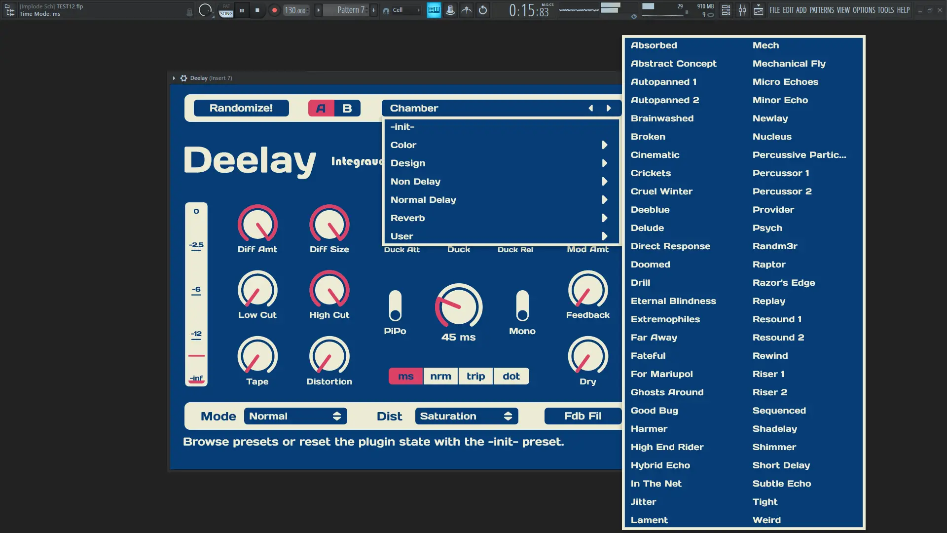 Интерфейс Deelay интуитивно понятен и ориентирован на быструю настройку. В центре расположен регулятор времени задержки, работающий в диапазоне от 0 до 1000 мс. Дополнительно доступны три синхронизированных режима — Normal, Triplet и Dotted — которые автоматически привязываются к BPM проекта. По бокам от основного регулятора находятся переключатели Ping Pong и Mono, управляющие стереоэффектами. Слева расположены элементы управления диффузией и фильтрами: Low Cut и High Cut позволяют ограничить частотный диапазон, а Fdb Filter влияет на сигнал обратной связи. Эффект ленты имитирует аналоговые искажения, включая Wow и Flutter, добавляя винтажную текстуру. Искажение можно настраивать по типу и интенсивности, от мягкого насыщения до агрессивной формы волны. Функция Duck помогает контролировать уровень эффекта, активируясь при появлении основного сигнала. На правой стороне находятся параметры модуляции — Amount и Rate, регулирующие глубину и скорость изменения времени задержки. Также доступны стандартные элементы: Feedback, Spread, Dry и Wet, дающие полный контроль над балансом.