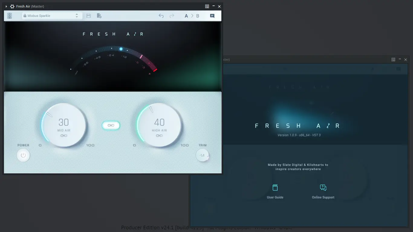 - Fresh Air — динамический высокочастотный процессор, который придаёт миксу ясность и воздушность, избегая при этом резкости и утомления слуха.