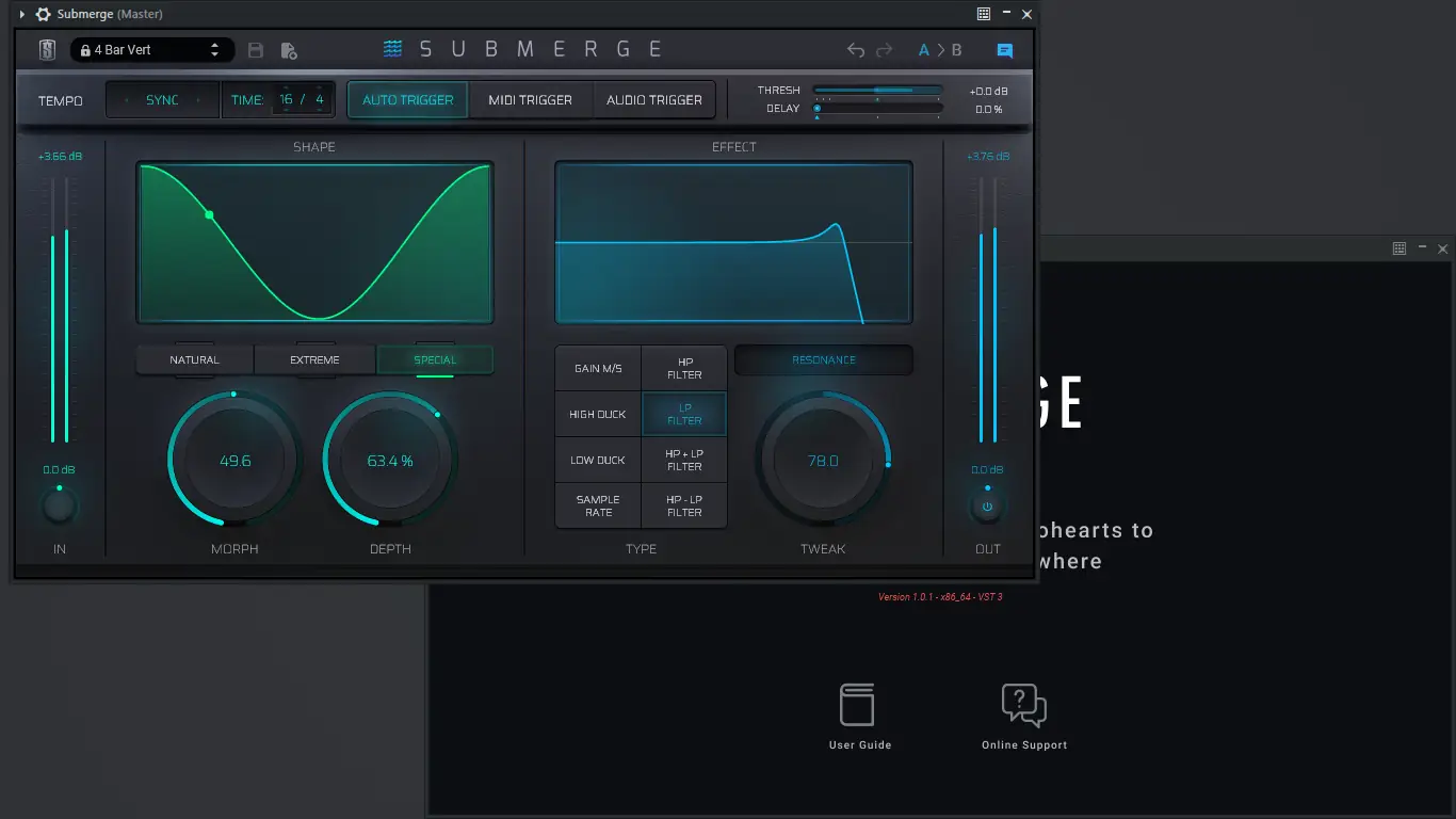 - Submerge — автоматический сайдчейн-плагин с восемью типами эффектов и тремя режимами триггера, идеально подходящий для динамического управления уровнем громкости и создания эффекта пульсации.