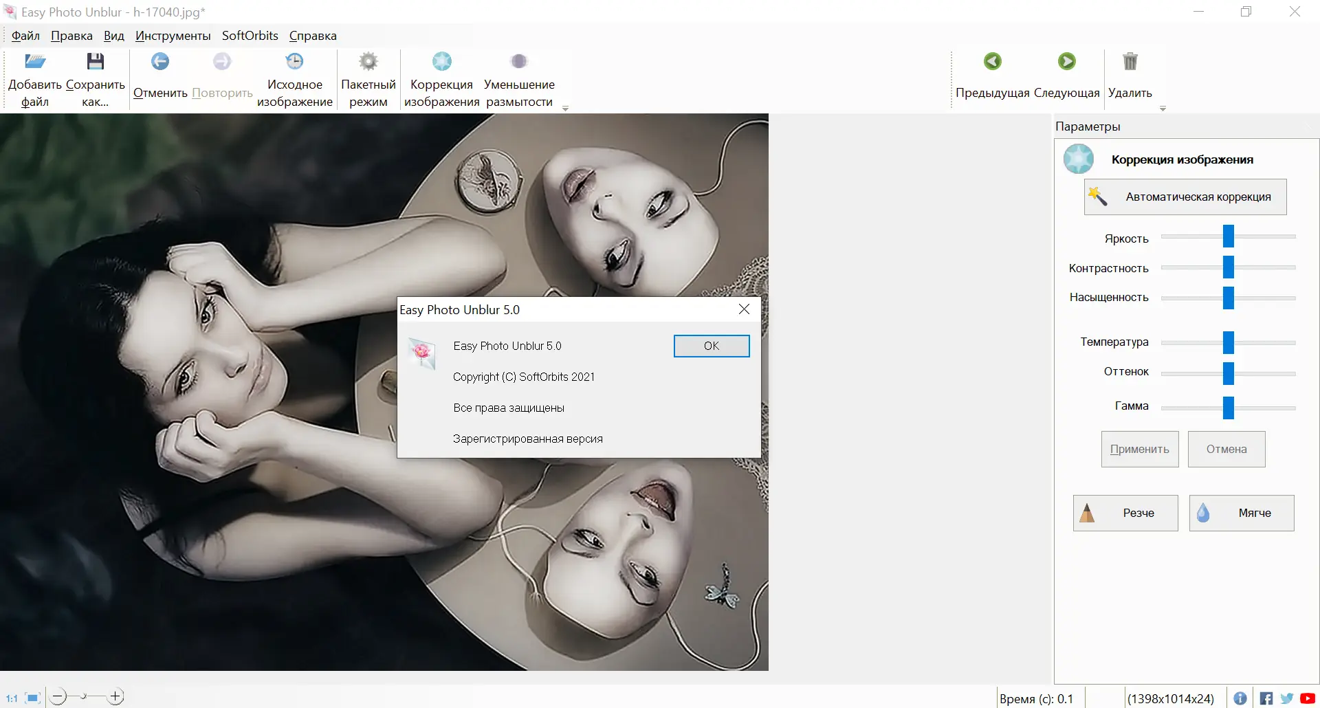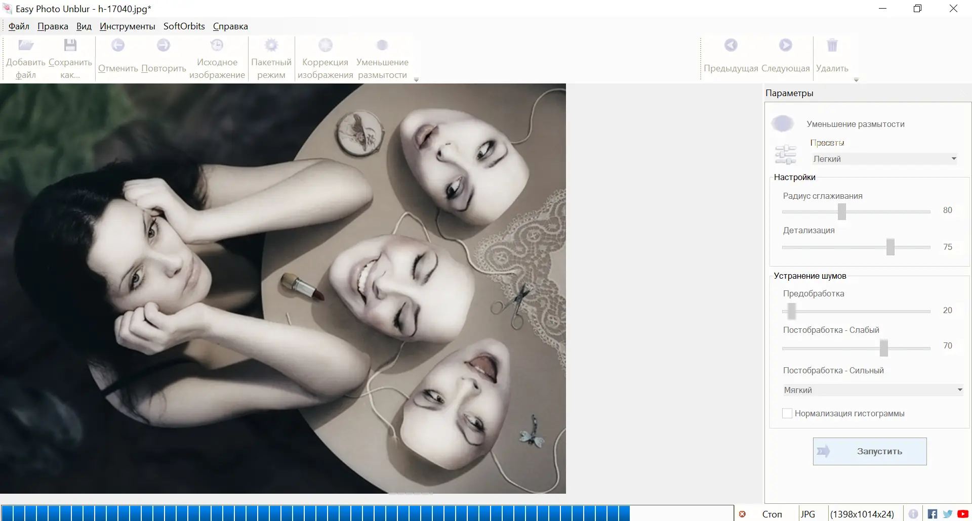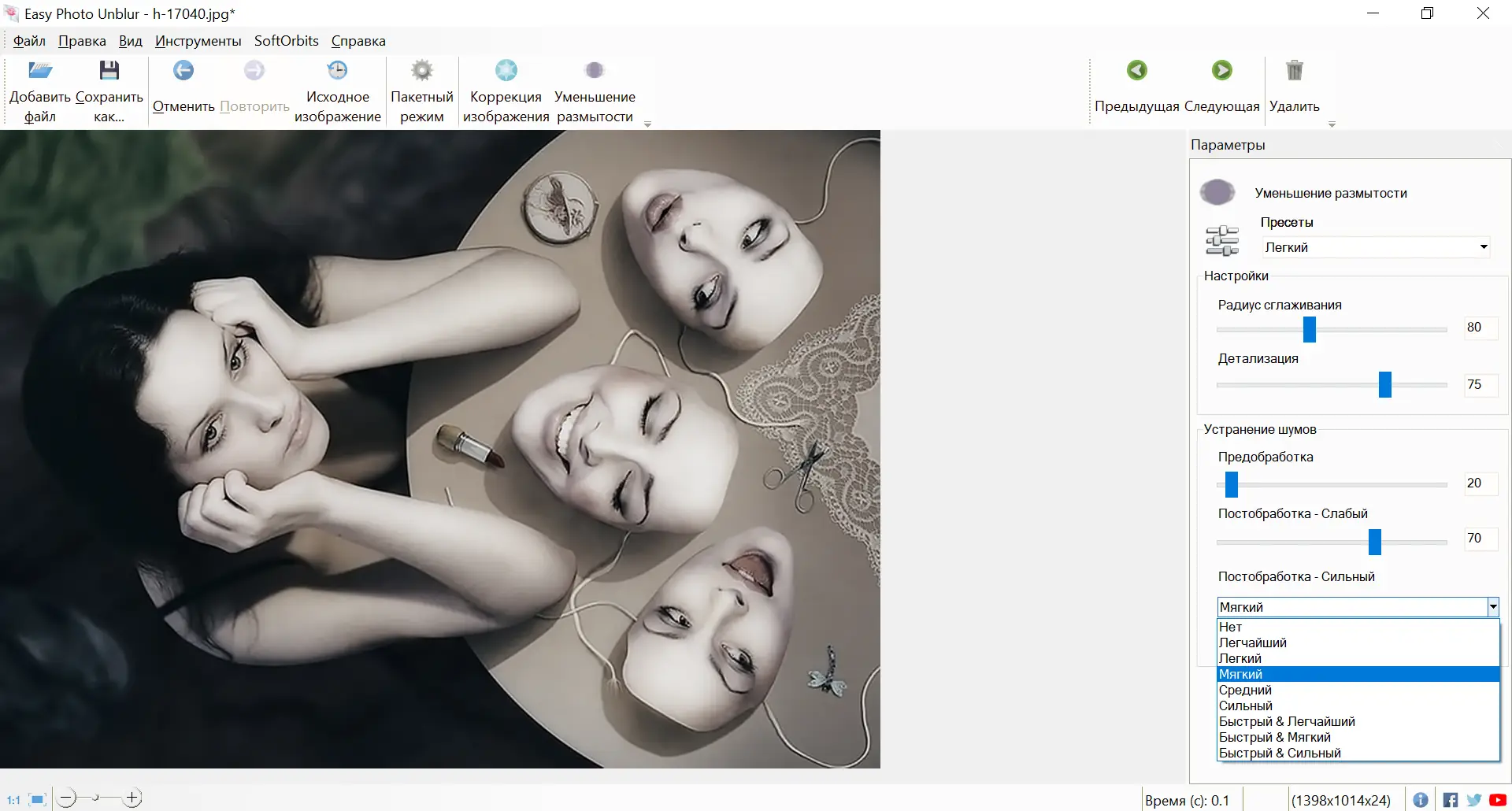 SoftOrbits Easy Photo Unblur — программа для автоматического восстановления размытых фотографий с помощью технологий искусственного интеллекта. Устраняет дефекты фокуса, дрожания камеры и движения объектов, восстанавливает чёткость и детализацию. Поддерживает пакетную обработку и включает инструменты коррекции изображений.