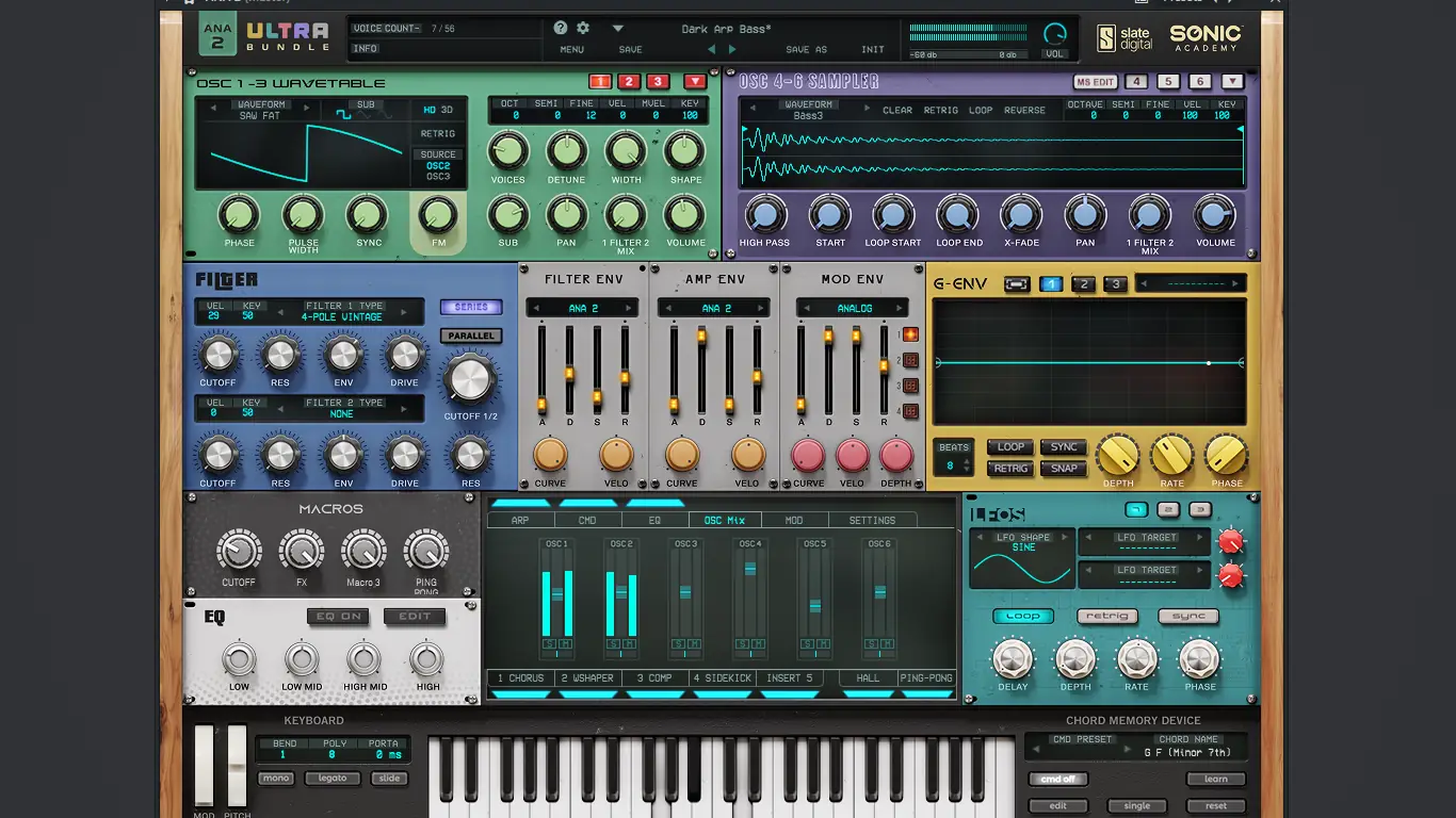 Sonic Academy & Slate Digital — ANA — это современный программный синтезатор, разработанный для профессиональных музыкантов, звукорежиссёров и продюсеров. Он сочетает в себе мощь аналогового моделирования, цифровые осцилляторы и широкие возможности для саунд-дизайна. Программа предлагает глубокую настройку звука, поддержку пользовательских семплов и волновых таблиц, а также встроенные эффекты мирового уровня. Архитектура ANA позволяет работать с полифонией, создавать сложные текстуры и управлять звуком с помощью макросов и матрицы модуляции.