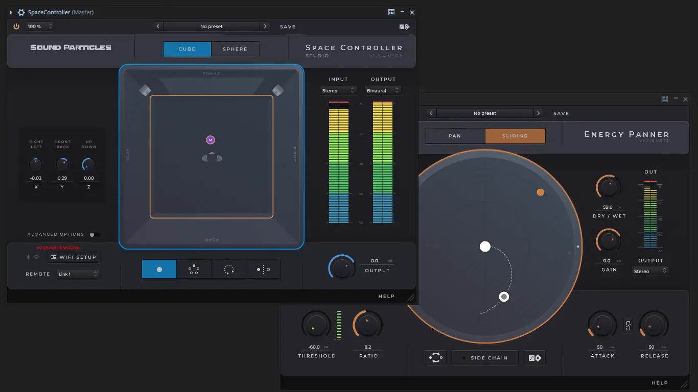 Программа интегрируется в стандартные DAW и работает как набор VST3, AU и AAX плагинов, что обеспечивает совместимость с большинством рабочих сред. Управление осуществляется через интуитивно понятные интерфейсы, где каждый параметр соответствует физическим акустическим явлениям. Например, в плагине Space Controller можно использовать мобильное устройство в качестве контроллера движения, превращая жесты в панорамирование звука в 3D-среде. Режимы Sphere и Cube позволяют выбирать между сферическим и кубическим подходом к пространственному звучанию в зависимости от задач проекта. Плагины поддерживают форматы до 3-го порядка Ambisonics и Dolby Atmos 7.1.2, что делает их пригодными для работы в профессиональных студиях. Все настройки сохраняются в проектах, обеспечивая воспроизводимость и гибкость при редактировании.