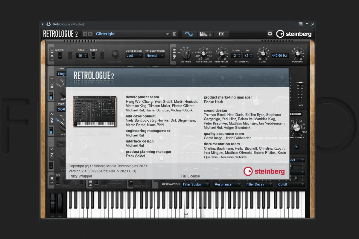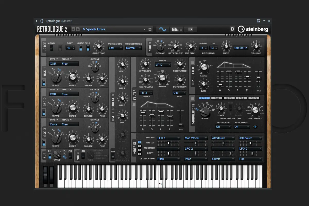 Retrologue 2 — это эволюция популярного виртуального аналогового синтезатора, разработанного с акцентом на точность имитации аналогового звучания и максимальную гибкость управления. Архитектура инструмента построена вокруг трёх полноценных осцилляторов, каждый из которых поддерживает до восьми голосов и предлагает широкий выбор форм сигналов, включая пилообразные, прямоугольные и синусоидальные волны. Дополняют основной звук sub-осциллятор и генератор шума, расширяя диапазон доступных тембров и позволяя создавать плотные, насыщенные слои.